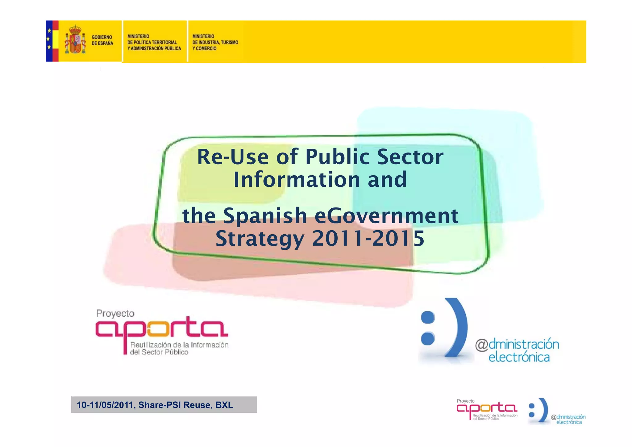 This document discusses Spain's strategy for reusing public sector information from 2011-2015. It provides context on the value of public sector information and the growth of efforts to promote its reuse in Spain. Initiatives like APORTA have helped foster a culture of reuse and transparency by raising awareness among government, citizens, and businesses. The strategy aims to further increase accessibility, visibility, and equal conditions for PSI reuse to maximize its value for economic and social benefits.