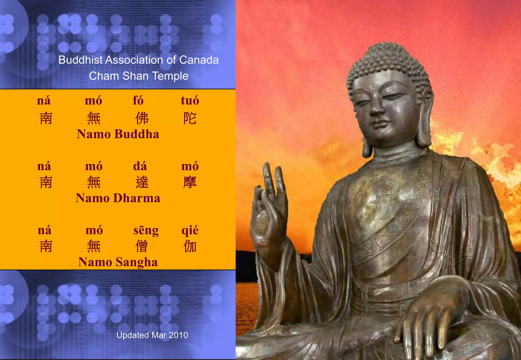 This document provides an introduction to Buddhist meditation and the Noble Eightfold Path. It explains the basic method of cessation-contemplation practice in meditation, which involves observing thoughts without judgment. It then describes the three qualities and eight components of the Noble Eightfold Path: wisdom (right view, intention), ethical conduct (speech, action, livelihood), and meditation (effort, mindfulness, concentration). Each component is explained in detail, outlining how followers can apply them to end suffering.