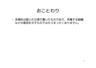 おことわり • 本資料は個人の立場で書いたものであり、所属する組織