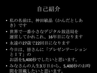 自己紹介私の名前は、神田敏晶(かんだとしあき)です世界で一番小さなデジタル放送局を運営してかれこれ、16年目になります永遠の27歳で22回目になります今日は、皆さんに「プレゼンテーションとIT」のお話を5,400秒でしたいと思います。みなさんの人生3万日から、5,400秒のお時間を頂戴したいと思います。