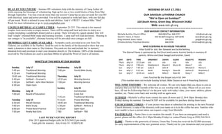 The Division 1 softball team's record is 4-1 and the Division 2 team's record is 2-3. Both teams have games tonight. Several groups and activities are mentioned such as Really Bad Girls book club, Sunday night basketball, and a Couples Retreat at Camp Luther in September. Donations are being collected for various causes such as pregnancy centers, Manna for Life food pantry, and The Gideons.