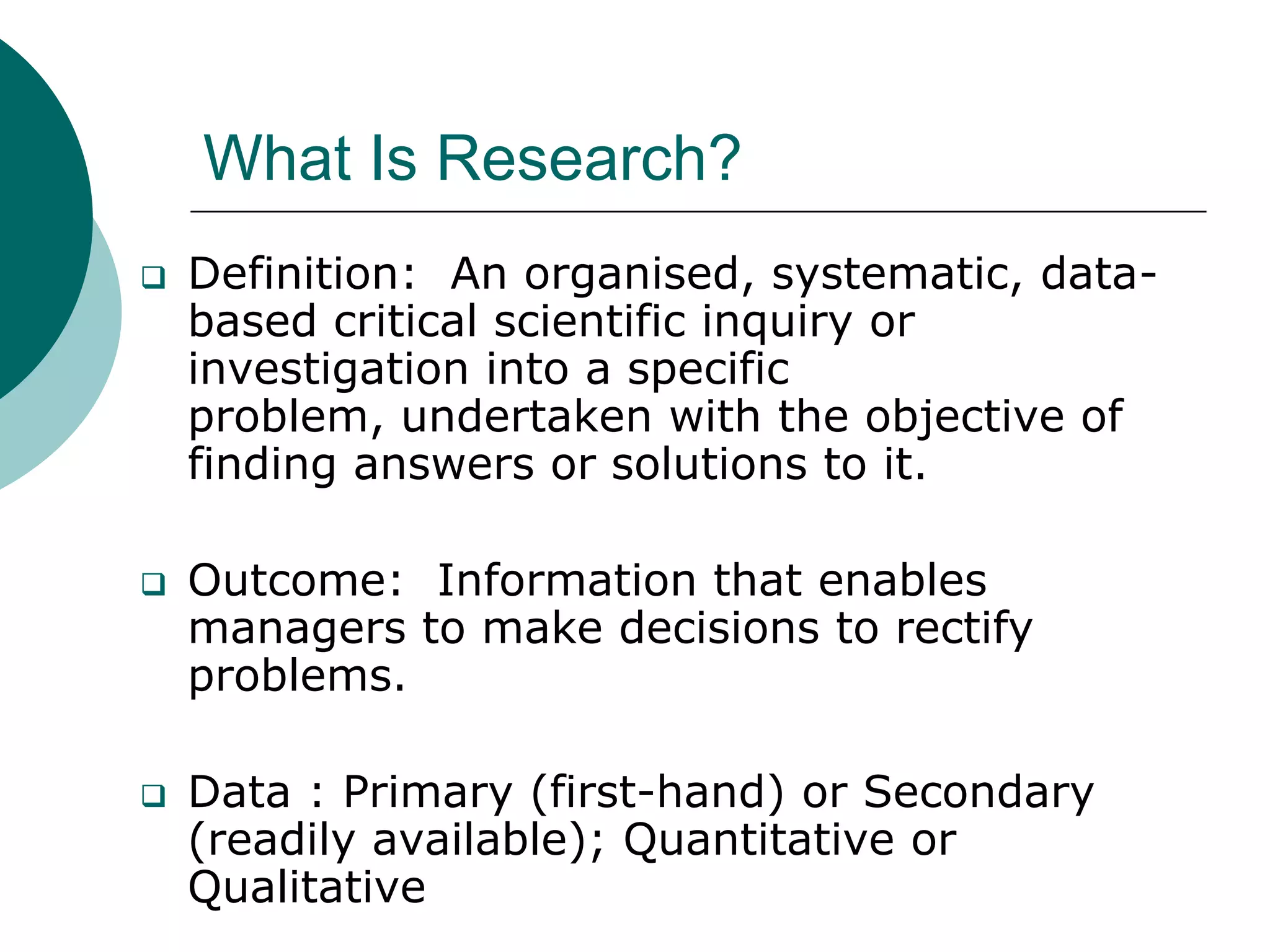 This document provides an introduction to research methods. It defines research as organized, systematic inquiry to solve problems through data collection and analysis. There are two main types of research: applied research aims to solve current organizational problems, while basic research increases general knowledge and builds theories. Research follows a systematic process including observation, problem definition, developing a theoretical framework, generating hypotheses, research design, data collection and analysis, and drawing conclusions. The goal is to produce information to help managers make informed decisions.