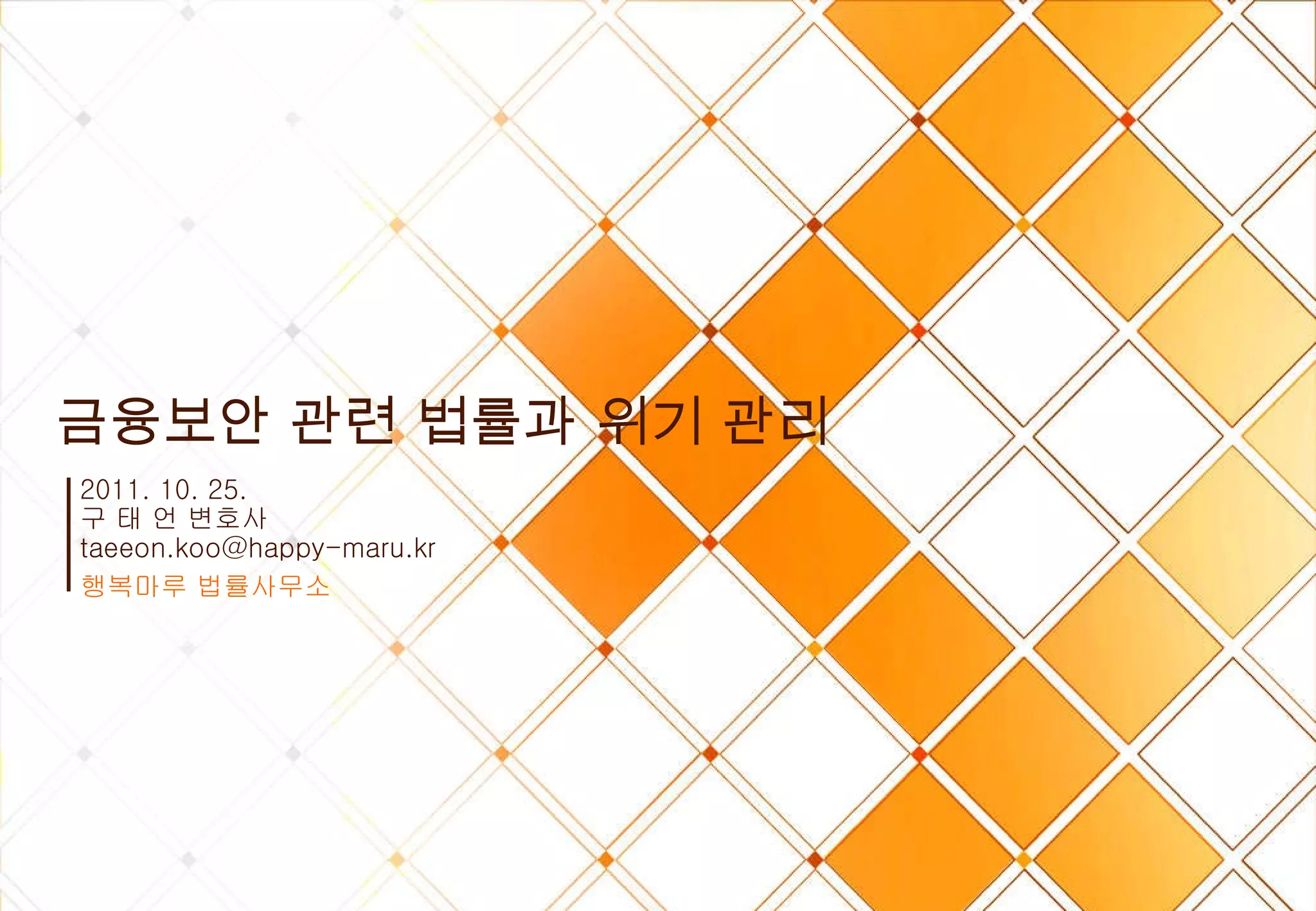 주요 금융보안 관련법령 요약 전자금융거래법 전자금융감독규정 및 시행세칙 정보통신망 이용촉진 및 정보 보호에 관한 법률 신용정보의 이용 및 보호에 관한 법률 전자금융거래 안전성확보와 이용자보호를 위한 각종 의무 인력 / 조직관리 , 외주관리 시설설비기준 , 정보기술시스템상 보호관리대책 ( 해킹방지 , 계정관리등 ), 내부통제에 관한 상세한 기준 준수의무 개인정보의 수집 / 이용 / 제공 / 파기에 관한 규제 개인정보보호를 위한 기술적 , 관리적 조치의무 및 기준 준수의무 ( 방통위 고시 ) -> 위반에 의한 정보유출 사고시 형사처벌 개인신용정보의 수집 / 이용 / 제공에 관한 규제 신용정보전산시스템의 안전보호 - 기술적•물리적•관리적 보안대책 수립의무 손해배상 입증책임의 전환 주요법령 개인정보보호법 개인정보의 수집 / 이용 / 제공 / 파기에 관한 규제 개인정보의 안전한 관리 ( 유출시 통지의무 ) 손해배상 입증책임의 전환 및 개인정보 단체소송 도입 금융실명거래 및 비밀보장에 관한 법률 실명확인의무 및 실명거래정보의 비밀보호 / 누설금지 의무 자본시장과 금융투자업에 관한 법률 금융투자회사의 내부통제기준 수립 및 운영 의무 NOTES
