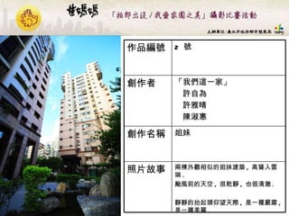 文档展示了一系列关于社区生活和自然风光的作品,每个作品通过照片故事表达了作者对生活的感悟和美好记忆。这些创作涵盖了景观、家庭记忆和对自然的观察,描绘了一个充满温馨与平和的社区氛围。作者们用独特的视角展现了生活的细腻与快乐,传递出对家和自然的深厚情感。