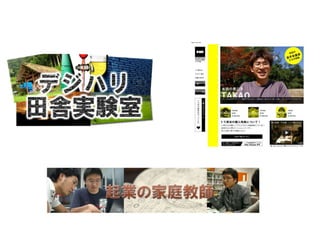– 少数のやる気のある地域の人がいらっしゃれば始める。 • 地域の人、あるいはそれに準ずる人とでないと出来な い。 – Uターンの支援がやりやすい • むしろ失敗しろ!どんどん失敗しろ! – ただし、大けがしない様にだけはする。 • ITは道具 – 地域に入ったらなんでもしなきゃいけない。 – マーケティング、ブランディング、商品開発、サイト制 作、広報、販売、営業、企画、ネットワーキング、経営、 製造、農作業