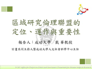 2010年12月21日 成大社會與行為科學研究倫理講習 -- 「人類研究倫理治理架構推動協調計畫」 by邱文聰老師 PPTX