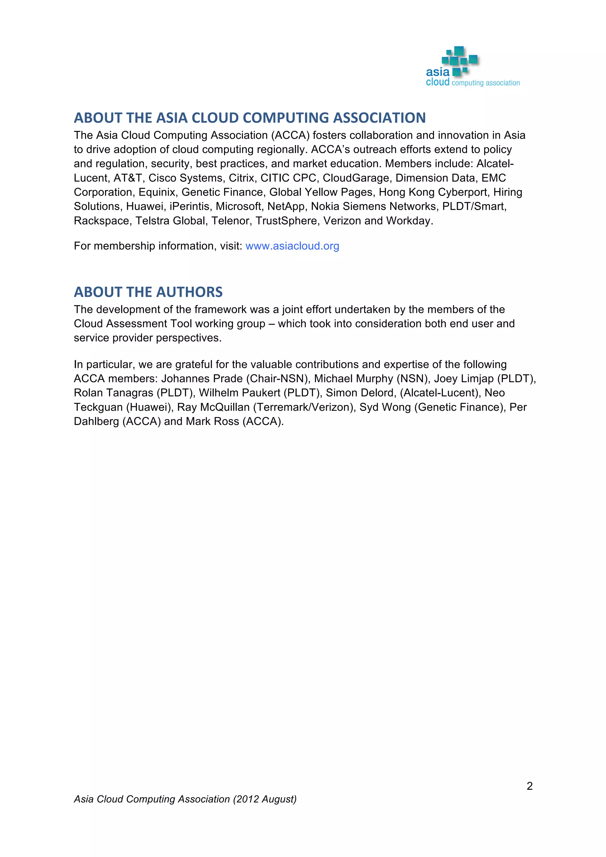 The Asia Cloud Computing Association (ACCA) developed a Cloud Assessment Tool (CAT) to help users define their cloud application requirements and assist providers in presenting standardized service offerings. The framework categorizes operational performance characteristics across eight categories and establishes four service levels, promoting clarity and reducing subjectivity in cloud solutions. The document, intended for stakeholder feedback, aims to enhance the framework's utility and encourages collaboration for its further development.