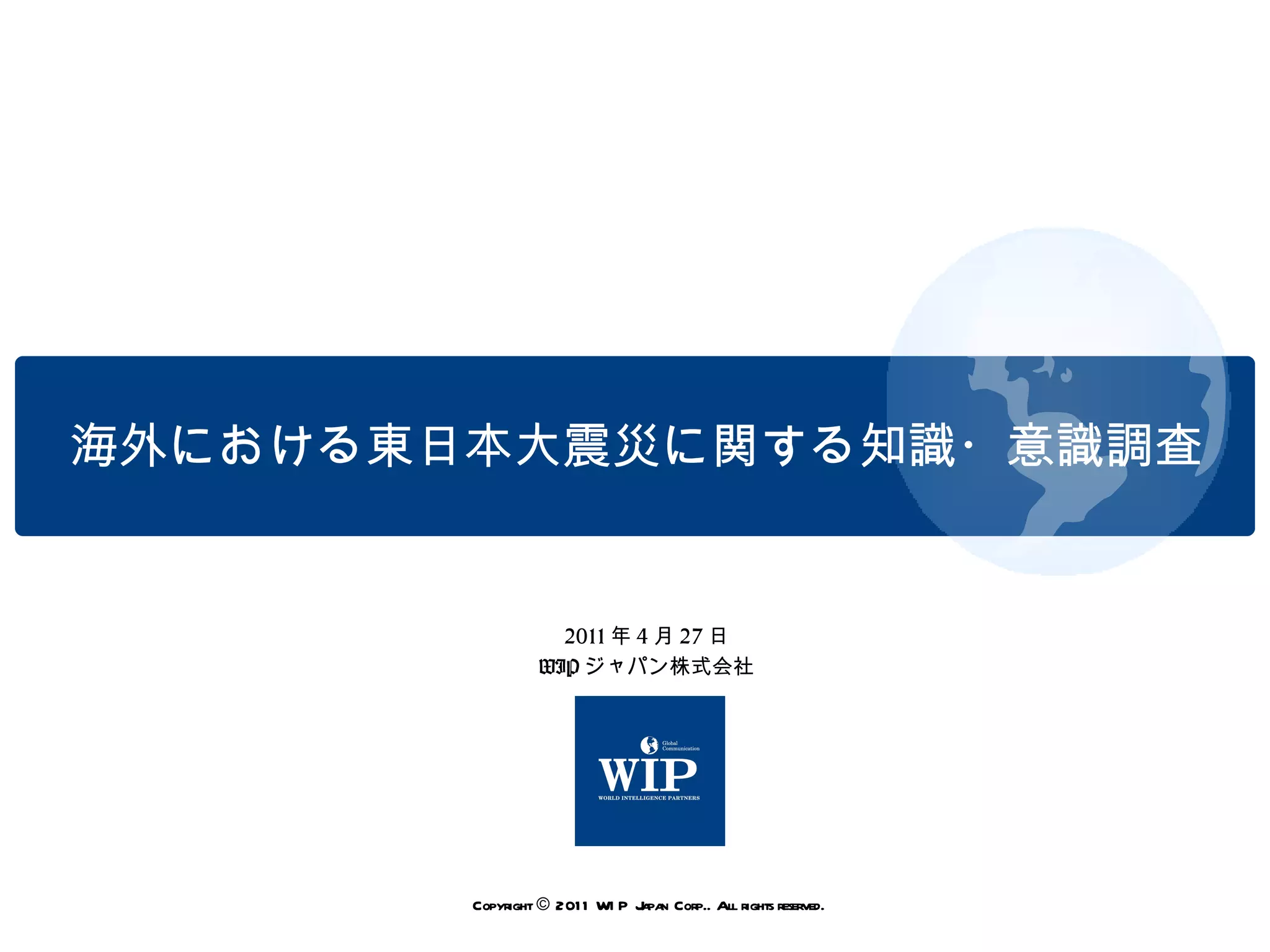 グローバルビジネス支援サービスを提供するWIP(ウィップ)ジャパン株式会社(本社:東京都千代田区、代表取締役:上田輝彦、以下、WIPジャパン)は、東日本大震災に対する海外の認識について調べるため、4月14日~18日、海外8か国でインターネット調査を実施しました。