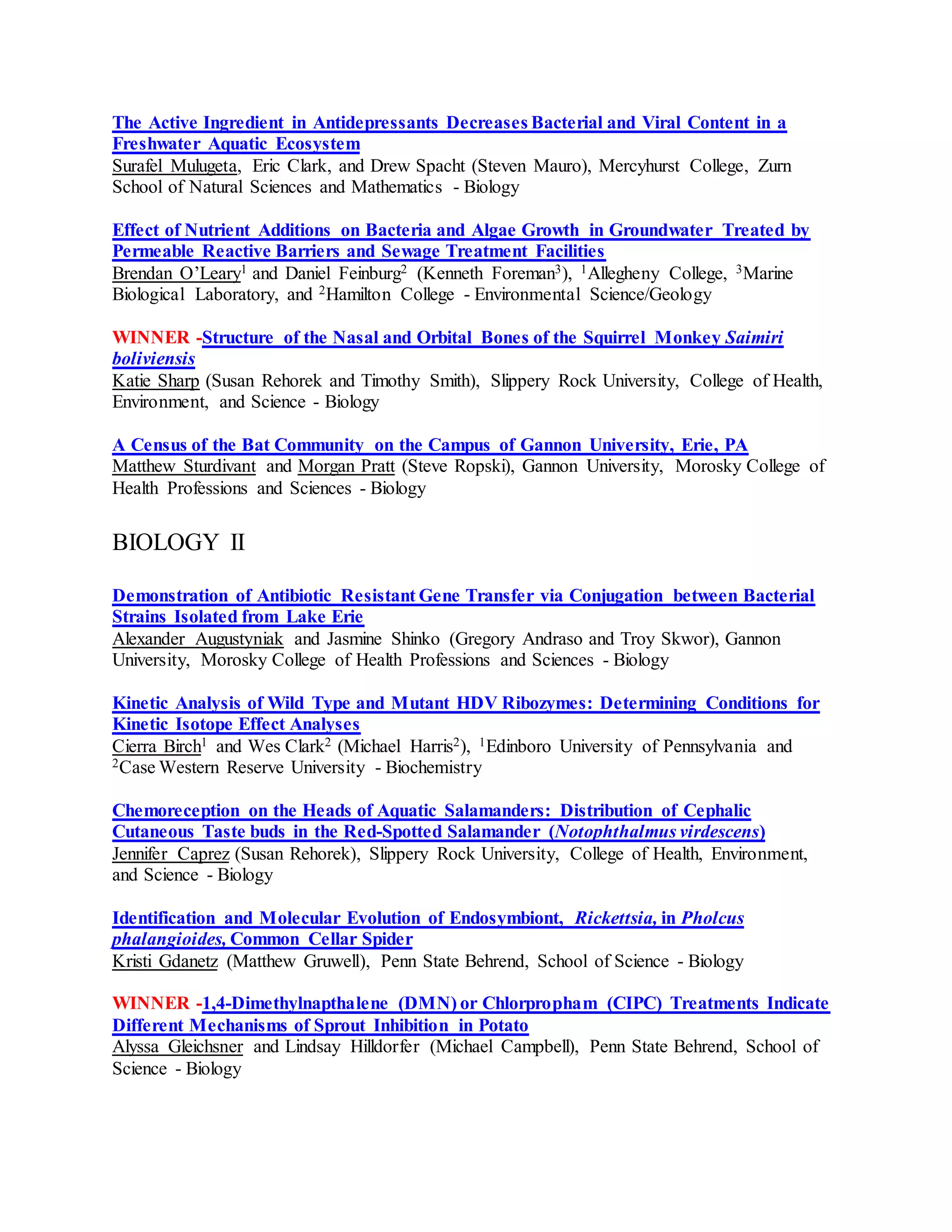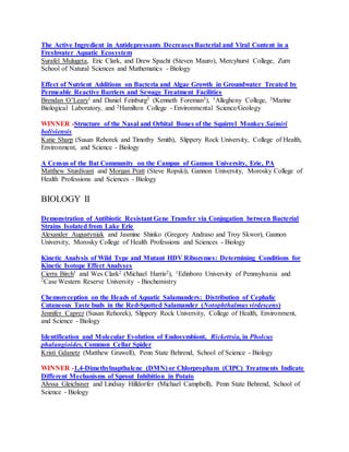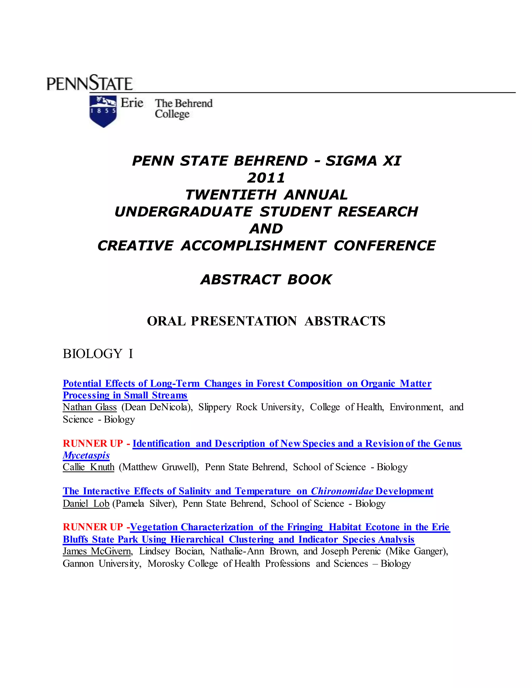 This document provides an abstract book for an undergraduate student research conference featuring oral presentations across various disciplines including biology, business, chemistry, computer science, engineering, history, mathematics, and psychology. It lists over 30 presentation abstracts in these fields, some labeled as winners or runners up. The abstracts provide brief summaries of each student's research including their names, academic institutions, and faculty advisors.