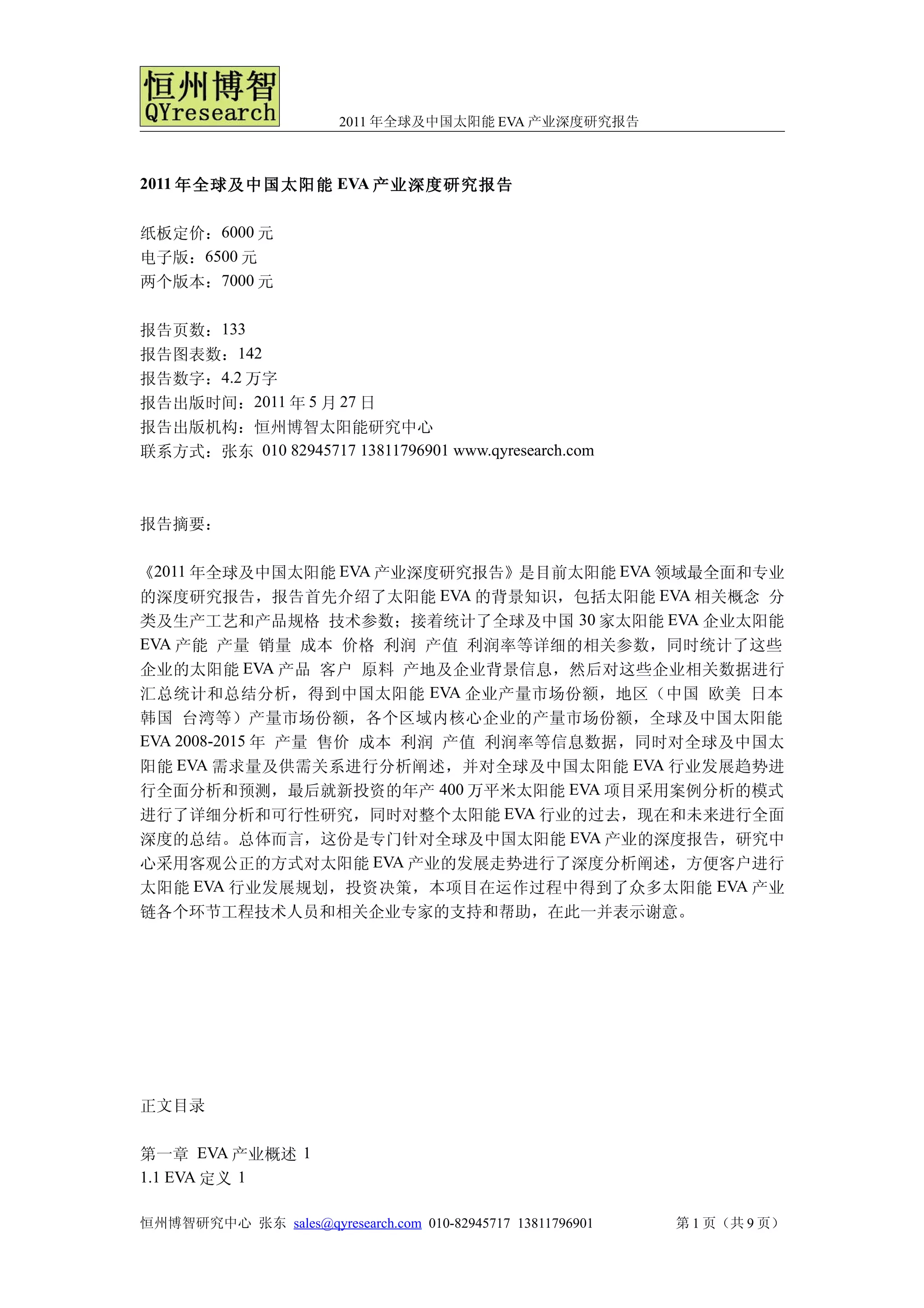 《2011年全球及中国太阳能EVA产业深度研究报告》详尽分析了太阳能EVA的背景知识、生产工艺、市场现状及未来发展趋势。报告涵盖了全球及中国主要EVA企业的生产能力、销售和市场份额等详细数据,为相关行业提供了投资决策和发展规划的参考。整体上,这是一份针对太阳能EVA产业的全面和专业的研究报告。
