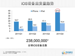 本报告总结了2011年及2012年初国内iOS设备的使用情况与应用下载趋势。报告指出,iPhone 4和iPad 1的市场占有率显著,用户的下载高峰主要集中在工作日的晚间时段。广东省的iOS用户数量居全国首位,整体用户规模集中在几个主要省市。