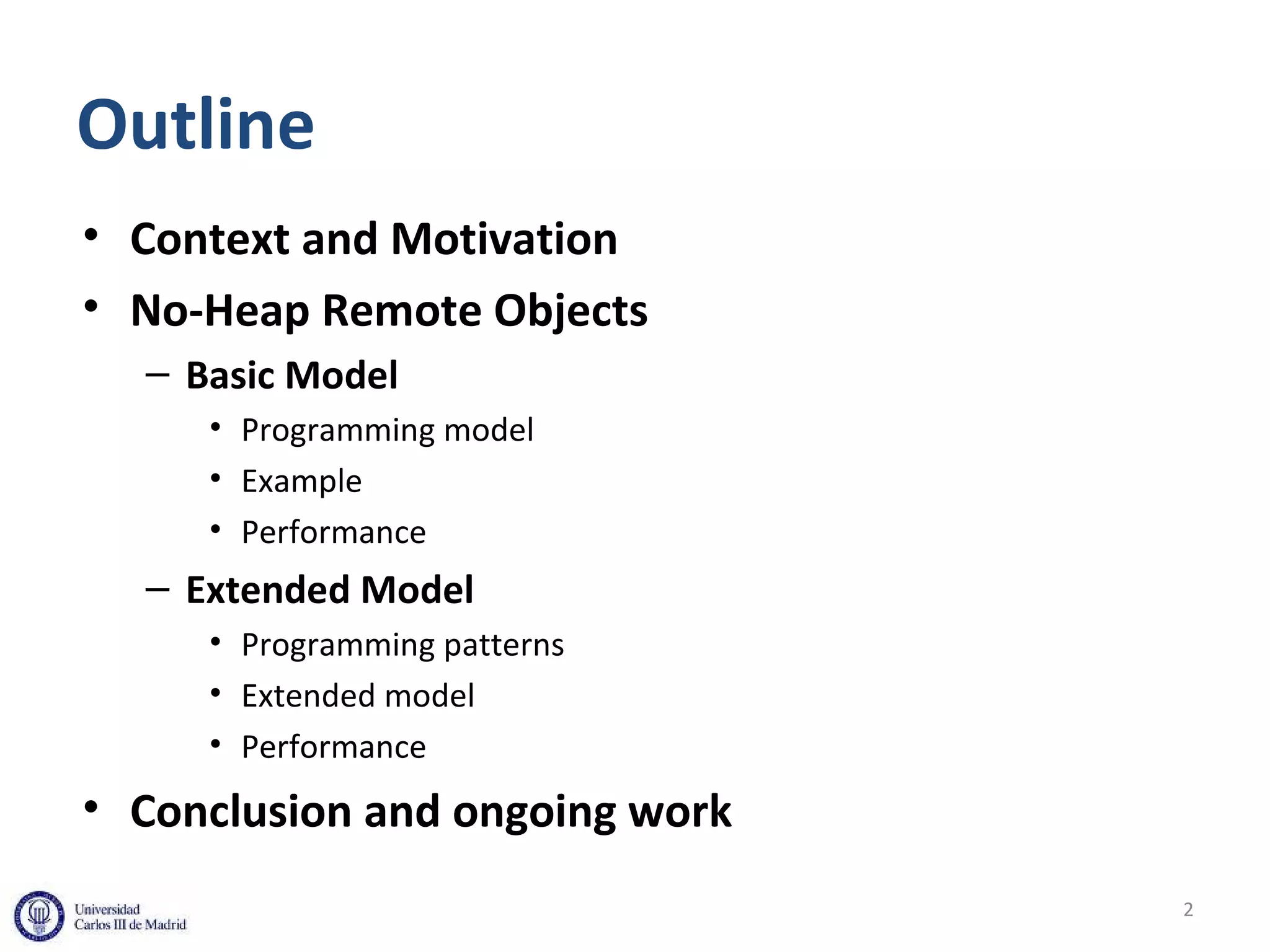 This document proposes a No Heap model for remote objects in distributed real-time Java systems. The model avoids garbage collection by containing objects within scoped memory areas. Remote objects have a creation context in immortal memory and invocation contexts in local temporary memory areas. This allows safe nesting of contexts by forbidding references from creation to invocation contexts while allowing references the other way. The model is compared to traditional garbage collected remote objects, showing it uses less time as it avoids garbage collection overhead.
