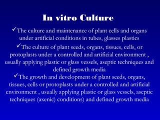 This document discusses in vitro plant breeding techniques. It describes in vitro culture as the growth and development of plant tissues, cells, or protoplasts under controlled artificial conditions using glass or plastic vessels. The key abilities of plants that allow for in vitro culture are totipotency, dedifferentiation, and competency. Important factors for successful in vitro culture include growth media, environmental conditions, and the explant source. The document outlines various types of in vitro culture including seed, embryo, organ, callus, cell suspension, and protoplast cultures. It also describes plant regeneration pathways such as microcutting, organogenesis, and somatic embryogenesis.