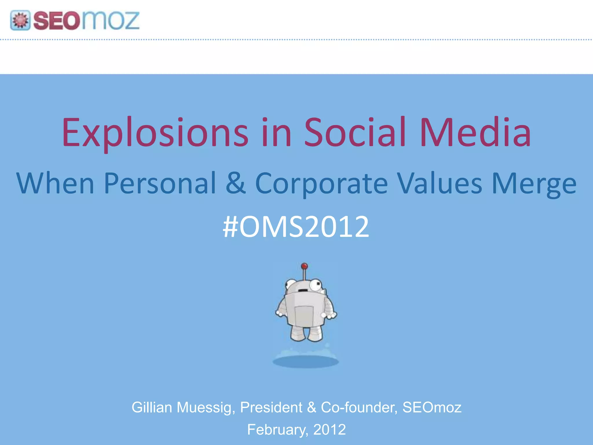 This document discusses Gillian Muessig's presentation at OMS2012. It begins with a quote about the end of traditional sales and includes several links to resources about storytelling, social media engagement, and branding. The core of the presentation discusses SEOmoz's strategy of using blogs, videos, infographics and other content to build an online community and drive organic traffic. It emphasizes the importance of transparency, authenticity and generosity to build trust and encourage sharing. The presentation concludes with a call for participants in a 60 day program to play with the SEOmoz community and potentially start their own.