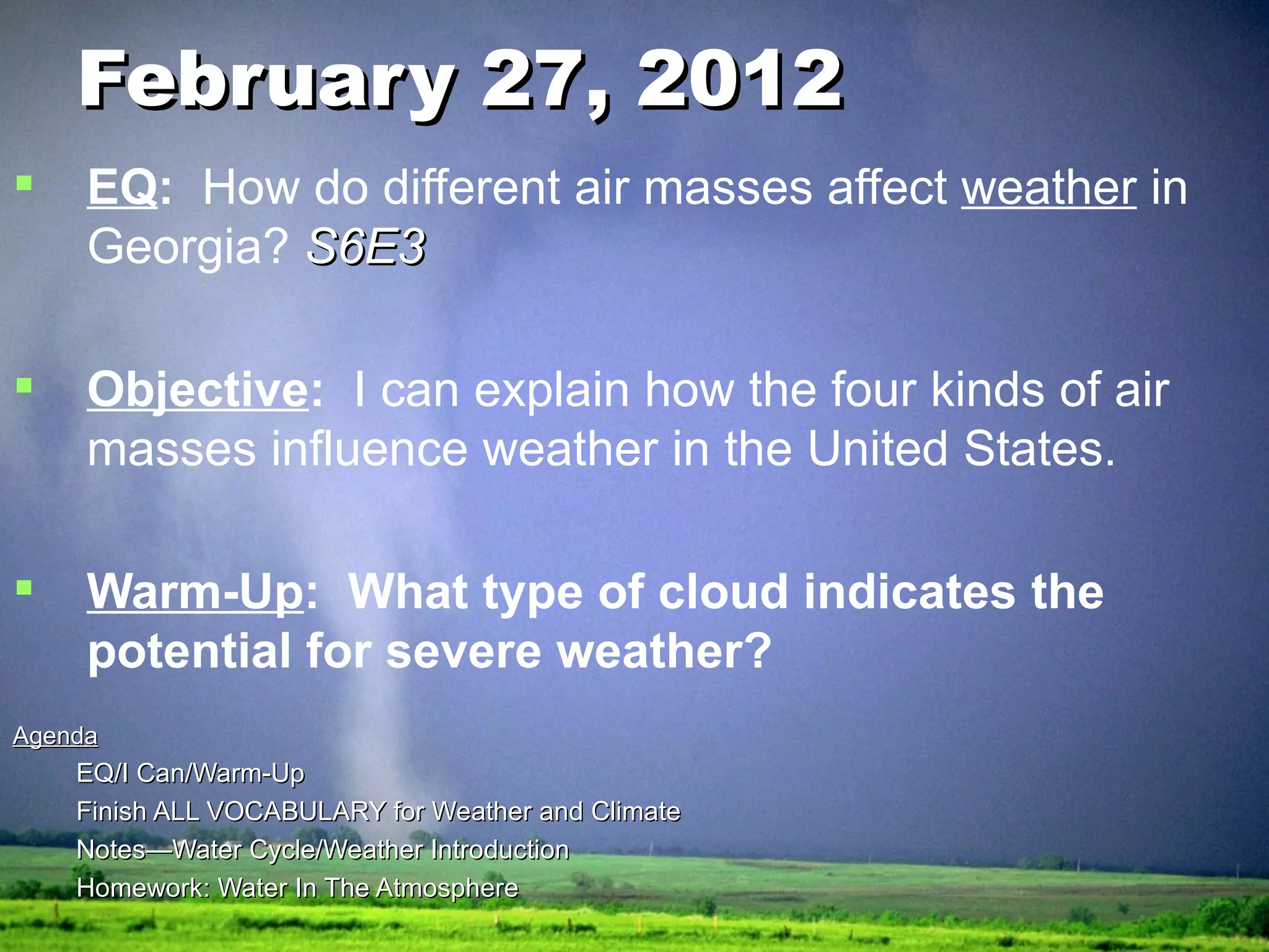 This document contains daily lesson plans for a 6th grade Earth science class covering weather and climate topics including air masses, fronts, cyclones, anticyclones, tornadoes and hurricanes. Each day focuses on an essential question and includes objectives, warm-up questions, and planned activities like completing notes, quizzes or videos. Key concepts covered are the four types of air masses and how they influence US weather, the four types of fronts and how they form and cause weather changes, and the differences between tornadoes and hurricanes in how they form.