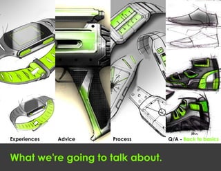 This document provides advice from an industrial design expert on improving sketching skills. It begins with an example of one of the expert's early sketches in design school that lacked detail, scale, and perspective. The expert encourages practicing the fundamentals of sketching boxes, spheres, and cylinders to master perspective. Regular practice, getting feedback from others, and using a sketchbook are also recommended. The expert demonstrates their sketching process and emphasizes practicing constantly to improve. Tips include focusing on the big picture of a design problem, presenting work professionally, and continuing to learn throughout one's career.