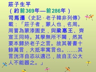 文档讨论了庄子与惠子的思想,特别是通过对话探讨人与自然、万物及自身的沟通与关系,强调自然法则与生命的和谐。惠子的学说展示了生活的哲학和伦理观,主张按照自然规律去理解和生活。整体主题围绕生命的自救与养生之道,通过对天地万物的观察与融会贯通,达到身心的平衡与和谐。