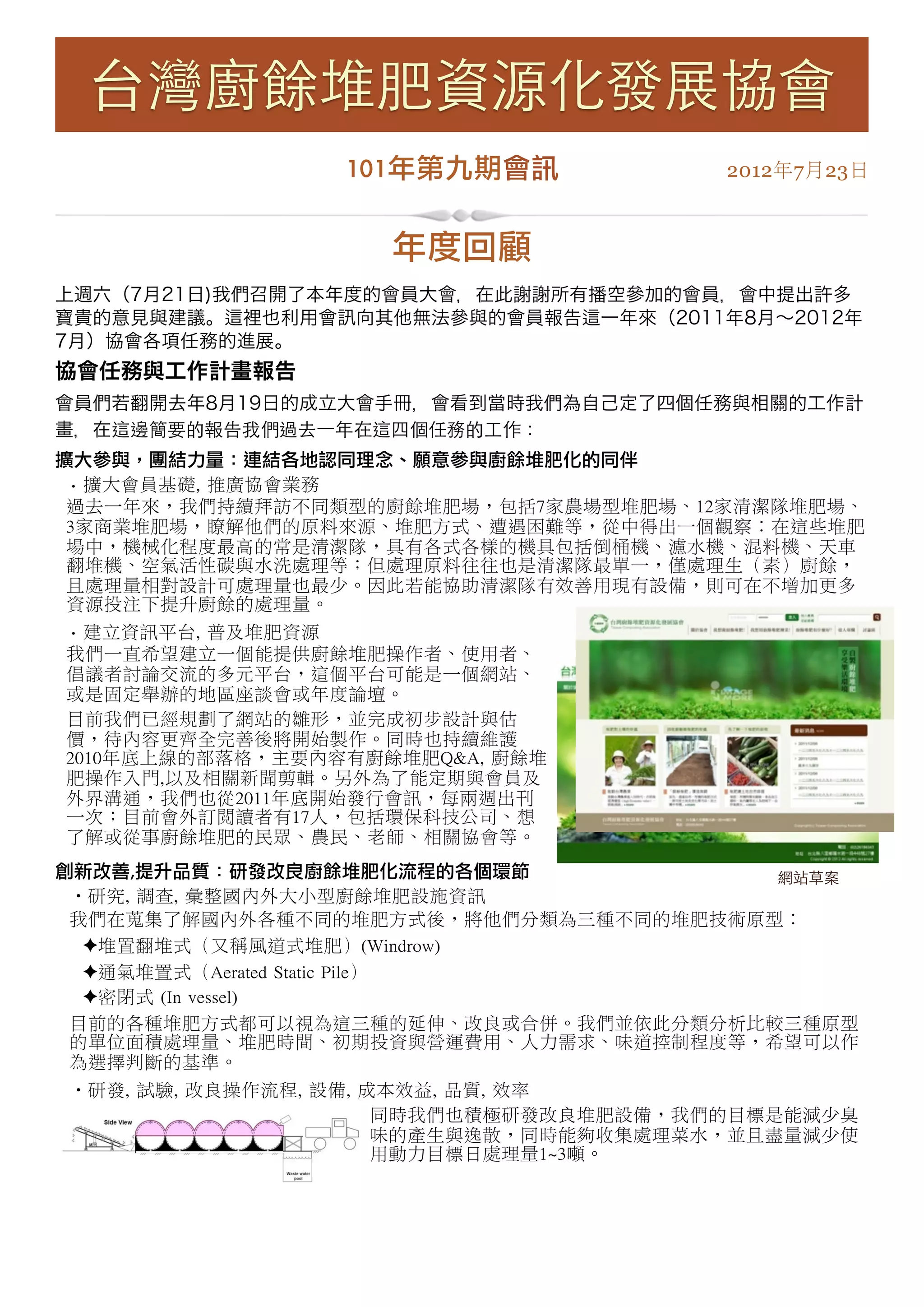 續發行會 、更新部落格;完成廚餘堆肥技術比較,建立建場決策樹;建立堆肥操作者培訓教材