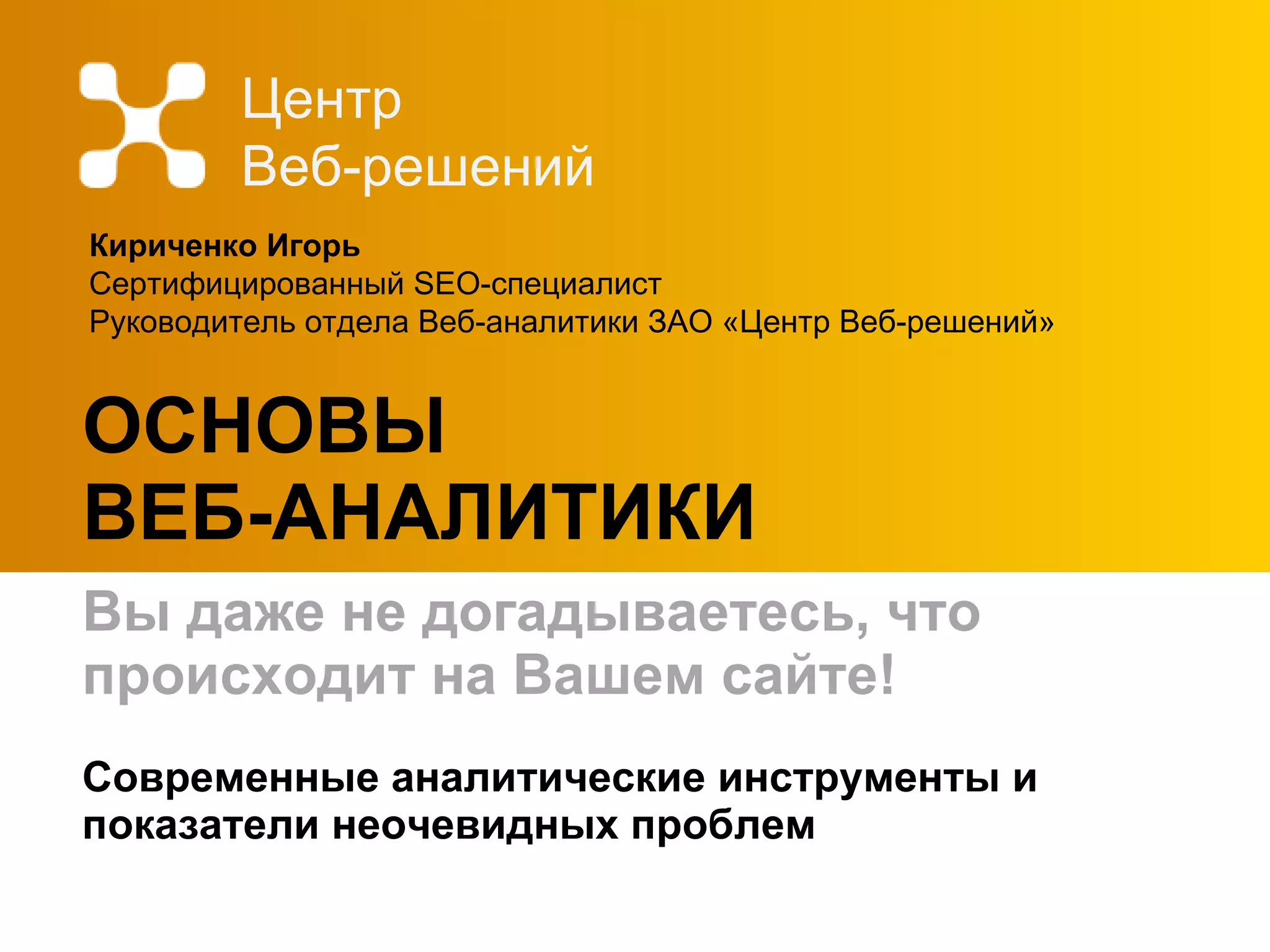 Документ обсуждает основы веб-аналитики и важность аналитических инструментов для понимания поведения пользователей на сайте. Он предлагает аналитические методы для оценки эффективности сайта и выявления проблем, таких как высокий показатель отказов и неэффективная реклама. Также упоминаются услуги по мониторингу и аудиту сайтов, предлагаемые Центром веб-решений.