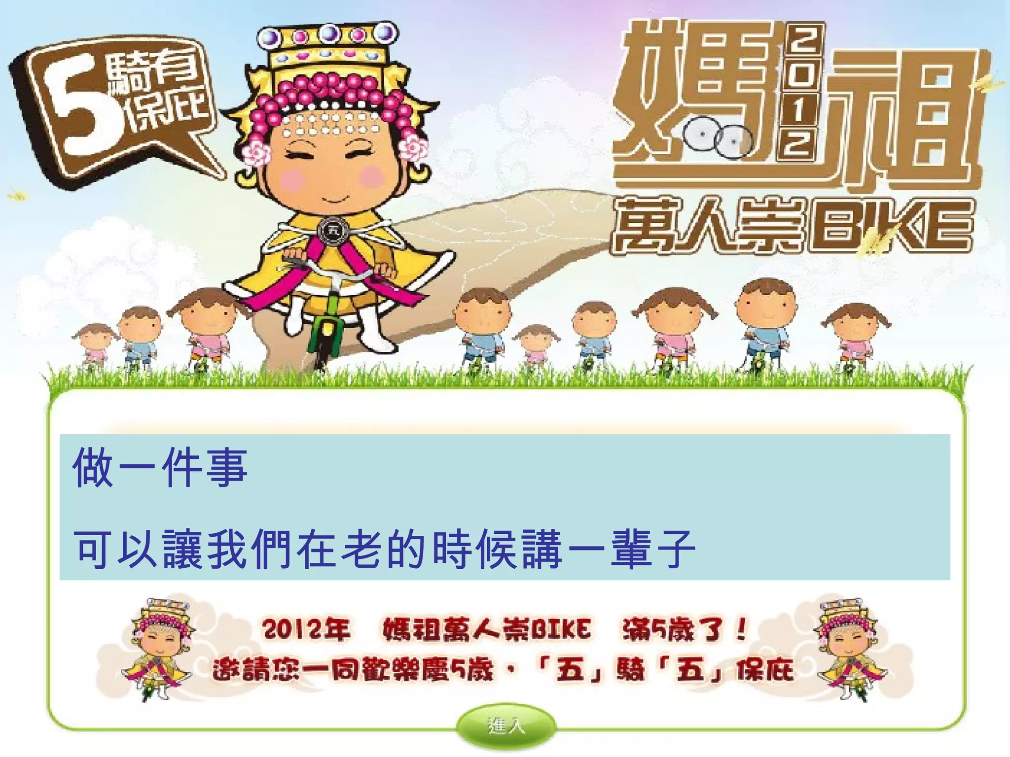 伴 崇 Bike 日期 :2012/02/18 集合時間 :AM04:45 前 ( 新北市板橋 ) 出發時間 :AM08:00( 台中大甲體育場 ) 集合地點 : 板橋新埔捷運站 ( 馥華飯店 ) 崇 Bike 費用 :500 元 ( 如需晶片另加 100 元 ) 交通費 : 來回接駁車 :800 元 or 參考捷安特服務