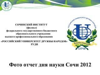 Документ представляет собой фотоотчет о проведении Дня науки в Сочинском институте, филиале Российского университета дружбы народов, в 2012 году. В нем представлена информация о мероприятиях и мероприятиях, состоявшихся в этот день. Отчет включает визуальные материалы, отражающие участие студентов и преподавателей.