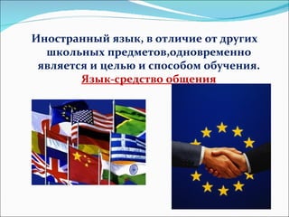 Документ описывает подходы к обучению иностранным языкам, подчеркивая важность социокультурного компонента и мотивации учащихся через интерактивные методы и проекты. Указаны темы работы учителей, их достижения и результаты участия учеников в олимпиадах по языкам. Основное внимание уделяется использованию современных учебников, интернет-ресурсов и проектной методики в учебном процессе.