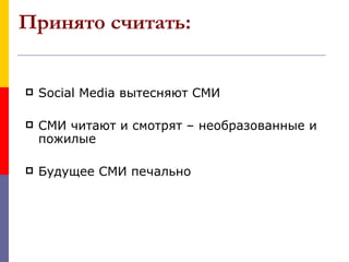 Документ рассматривает роль социальных медиа в современных коммуникациях, подчеркивая, что они не могут полностью заменить традиционные СМИ, но эффективно дополняют их. Основное внимание уделяется важности мониторинга репутации, управлению коммуникацией и использования обратной связи для достижения маркетинговых целей. Также обсуждаются стратегии взаимодействия с аудиторией и подходы к созданию контента.