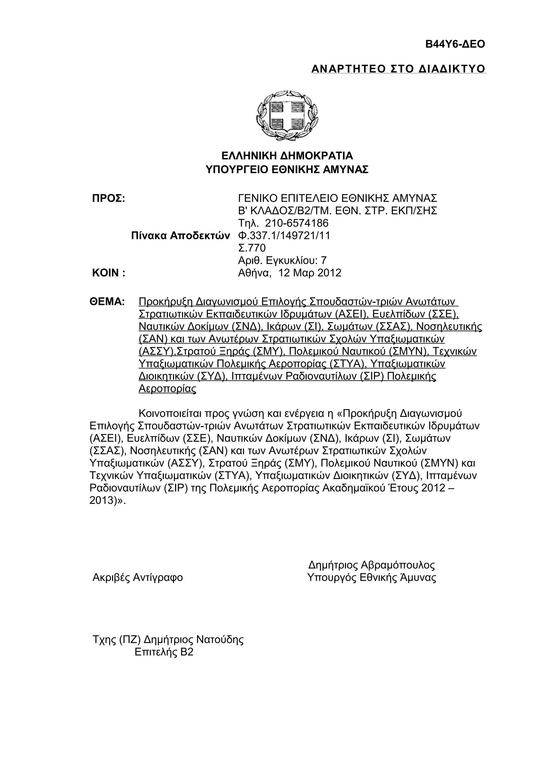 Στρατιωτικές Σχολές Υπαξιωματικών (ΑΣΣΥ) κατά το ακαδημαϊκό έτος 2012 –