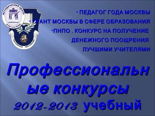 Документ описывает конкурс 'Педагог года Москвы', который способствует повышению статуса педагогических работников и раскрытию их творческого потенциала. Конкурс предоставляет равные возможности для педагогов различного уровня, включая новичков и опытных учителей. Он является важным событием в системе образования Западного учебного округа, где в 2012 году 55 участников получили гранты за высокие достижения в педагогической деятельности.