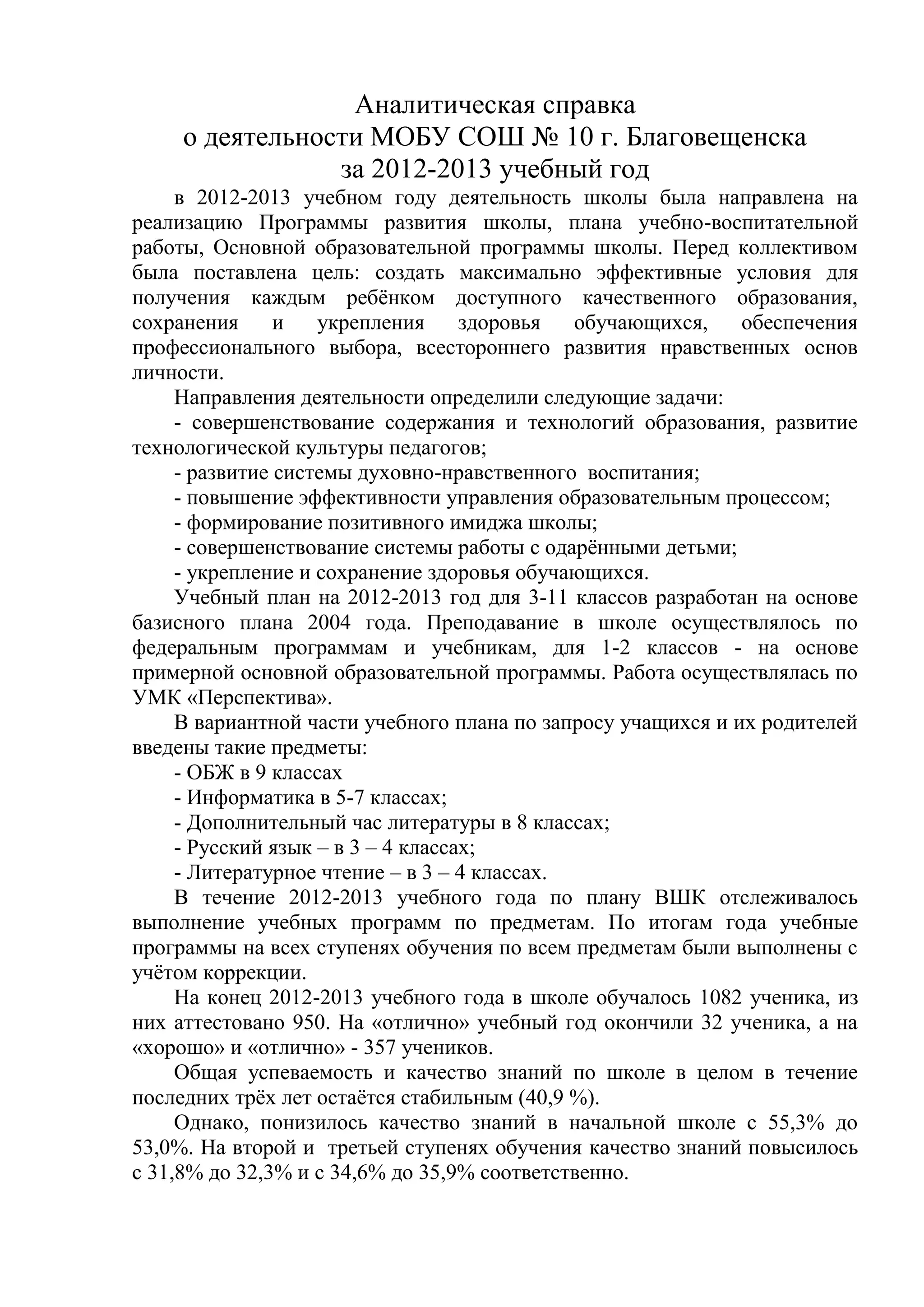 Аналитическая справка о деятельности Моб. Сош No 10 г. Благовещенска за 2012-2013 учебный год подчеркивает стремление школы создать эффективные условия для качественного образования и всестороннего развития учащихся. Основные достижения включают стабильную успеваемость, однако отмечается снижение качества знаний в начальной школе и проблемы с учебной мотивацией. Школа также акцентирует внимание на работе с одаренными детьми и разработке индивидуальных подходов в обучении.
