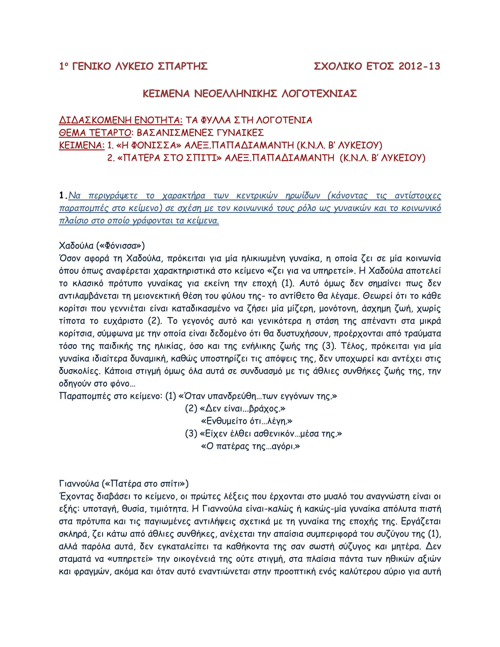ΚΕΙΜΕΝΑ: 1. «Η ΦΟΝΙΣΣΑ» ΑΛΕΞ.ΠΑΠΑΔΙΑΜΑΝΤΗ (Κ.Ν.Λ. Β’ ΛΥΚΕΙΟΥ)
