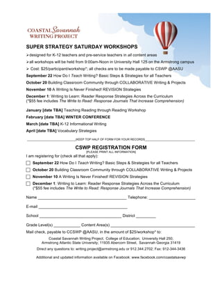 The document outlines a series of workshops for K-12 teachers and pre-service teachers, scheduled from September to April at the Armstrong campus, aimed at enhancing writing instruction strategies. Each workshop costs $25, with options including teaching writing, building classroom community, and teaching reading through various techniques. Registration forms and payment details are provided for participants interested in attending these professional development sessions.