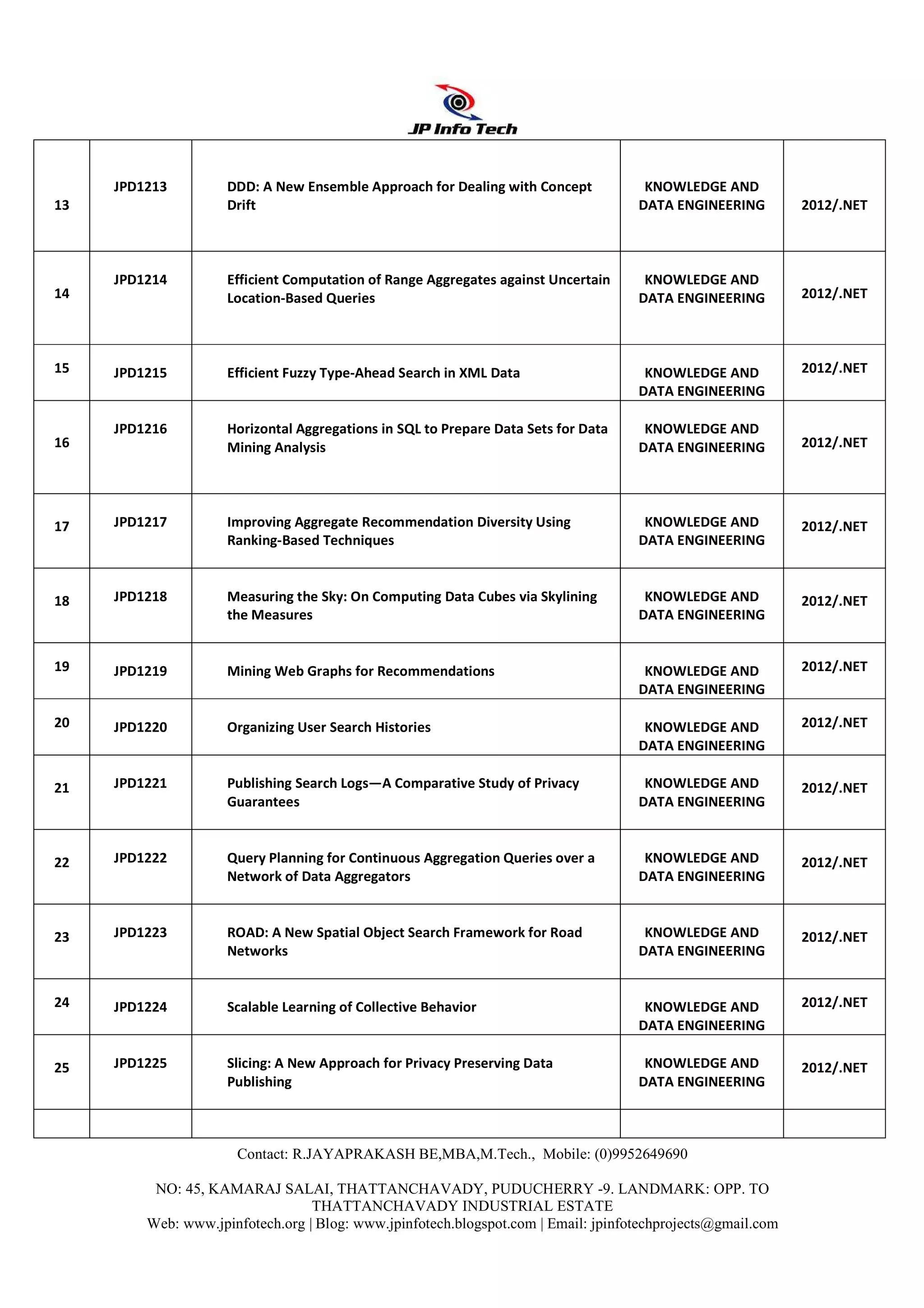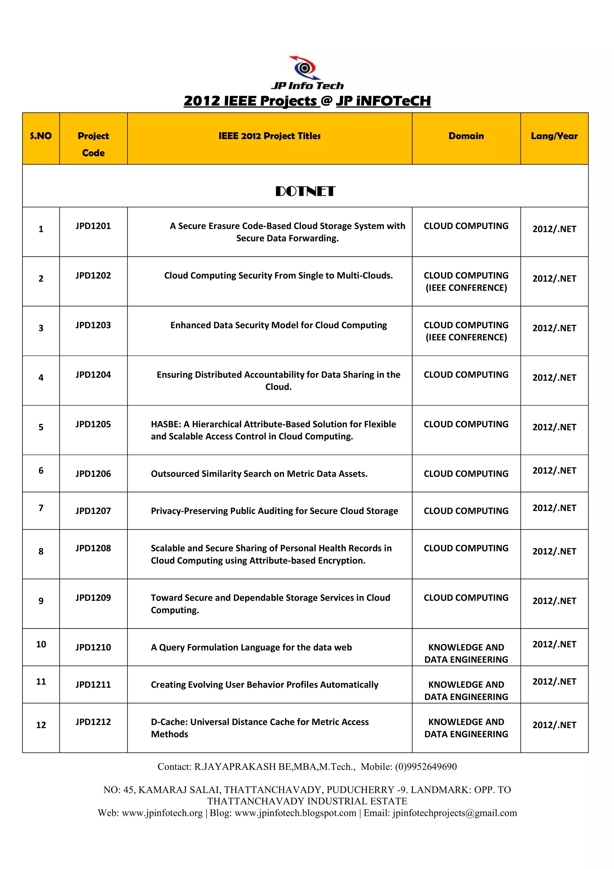 The document lists a variety of IEEE projects from 2012, categorized under domains such as cloud computing, data engineering, and image processing. Each project includes titles, domains, and programming languages used, primarily .NET. Contact information for project coordination is provided, along with support for students pursuing projects.