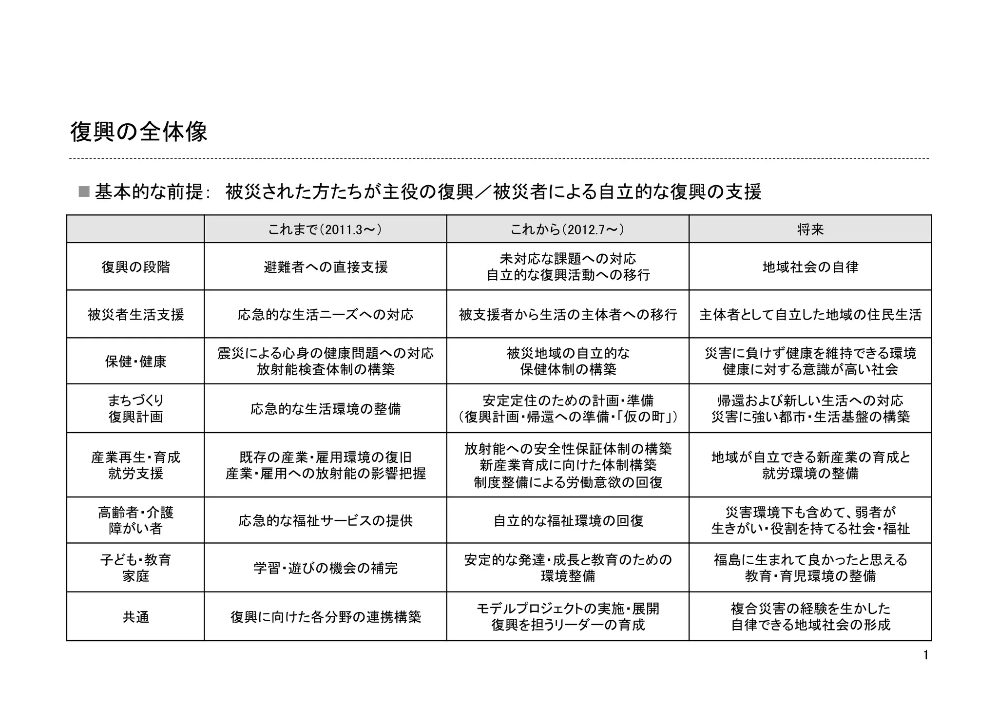 これまで(2011.3∼) これから(2012.7∼) 将来 未対応な課題への対応 復興の段階 避難者への直接支援 地域社会の自律 自立的な復興活動への移行 被災者生活支援 応急的な生活ニーズへの対応 被支援者から生活の主体者への移行 主体者として自立した地域の住民生活 震災による心身の健康問題への対応 被災地域の自立的な 災害に負けず健康を維持できる環境 保健・健康 放射能検査体制の構築 保健体制の構築 健康に対する意識が高い社会 まちづくり 安定定住のための計画・準備 帰還および新しい生活への対応 応急的な生活環境の整備 復興計画 (復興計画・帰還への準備・「仮の町」) 災害に強い都市・生活基盤の構築 放射能への安全性保証体制の構築 産業再生・育成 既存の産業・雇用環境の復旧 地域が自立できる新産業の育成と 新産業育成に向けた体制構築 就労支援 産業・雇用への放射能の影響把握 就労環境の整備 制度整備による労働意欲の回復 高齢者・介護 災害環境下も含めて、弱者が 応急的な福祉サービスの提供 自立的な福祉環境の回復 障がい者 生きがい・役割を持てる社会・福祉 子ども・教育 安定的な発達・成長と教育のための 福島に生まれて良かったと思える 学習・遊びの機会の補完 家庭 環境整備 教育・育児環境の整備 モデルプロジェクトの実施・展開 複合災害の経験を生かした 共通 復興に向けた各分野の連携構築 復興を担うリーダーの育成 自律できる地域社会の形成 1