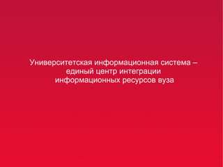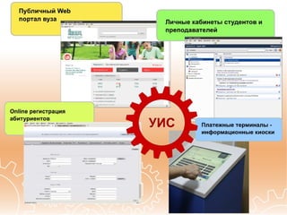 Документ описывает университетскую информационную систему (УИС), которая интегрирует информационные ресурсы вуза и автоматизирует его деятельность с 2005 года. УИС охватывает приемную кампанию, управление учебными планами, расписаниями, деканатом, кадровым документооборотом и сервисами для студентов и преподавателей. Внедрение системы предполагает использование открытых программных продуктов и предоставляет полную техническую поддержку.