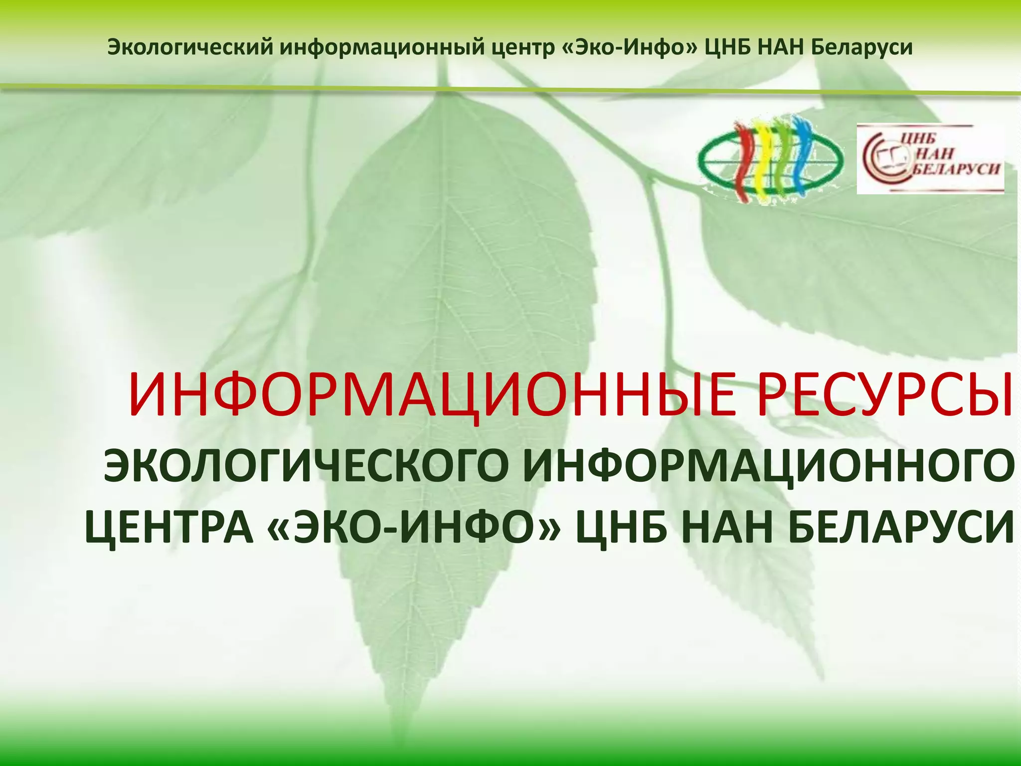 Экологический информационный центр «Эко-инфо» ЦНБ НАН Беларуси обеспечивает доступ к экологической информации и содействует общественности в решении проблем охраны окружающей среды, гарантируя право на информацию о состоянии природной среды. Центр создан в соответствии с Орхусской конвенцией и разрабатывает электронные ресурсы для удовлетворения информационных потребностей и повышения экологической культуры. Основные направления деятельности включают контент-менеджмент, интеграцию с социальными сетями и выпуск электронных периодических изданий.