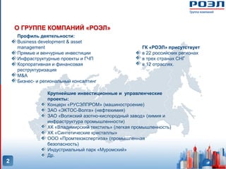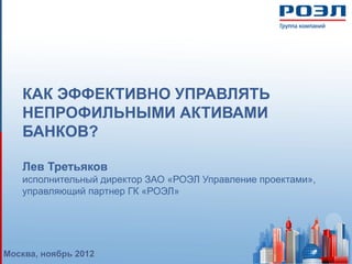 Документ описывает подходы к эффективному управлению непрофильными активами банков, предоставляя примеры успешной реструктуризации долгов различных компаний. Также рассматриваются проблемы, связанные с активами и меры, необходимые для их оптимизации, включая юридические мероприятия и поиск стратегических инвесторов. Представлены примеры успешных кейсов из различных отраслей и рекомендации по улучшению финансового положения компаний.