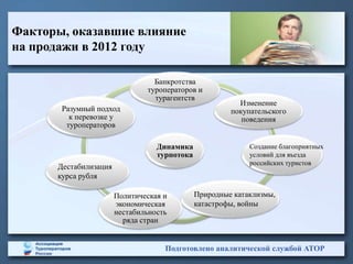 Документ содержит анализ выездного туризма в России за 2012 год, выделяя ключевые факторы, такие как банкротства туроператоров, изменение поведения покупателей и политическая нестабильность. Основное внимание уделяется динамике продаж в различных направлениях, с указанием долей туристов по странам и длине туров. Также рассматриваются ценовые категории туров и глубина их бронирования, что позволяет сделать выводы о тенденциях на рынке.