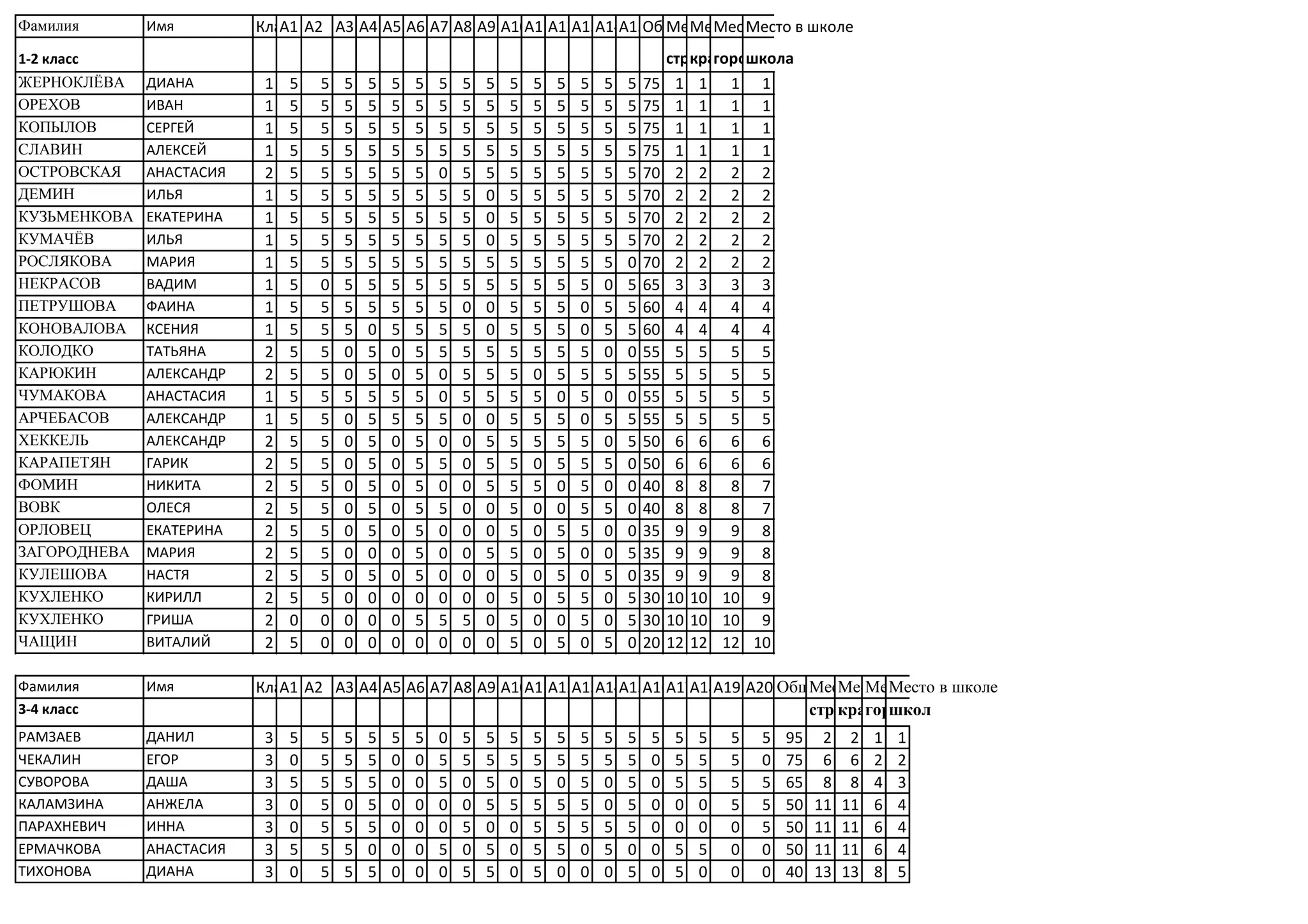Документ содержит таблицу с оценками учащихся, включая их фамилии, имена и баллы по различным предметам. В таблице указаны общие баллы, места учащихся в классе, городе и стране. Наивысшие показатели наблюдаются у нескольких студентов с одинаковыми общими баллами.