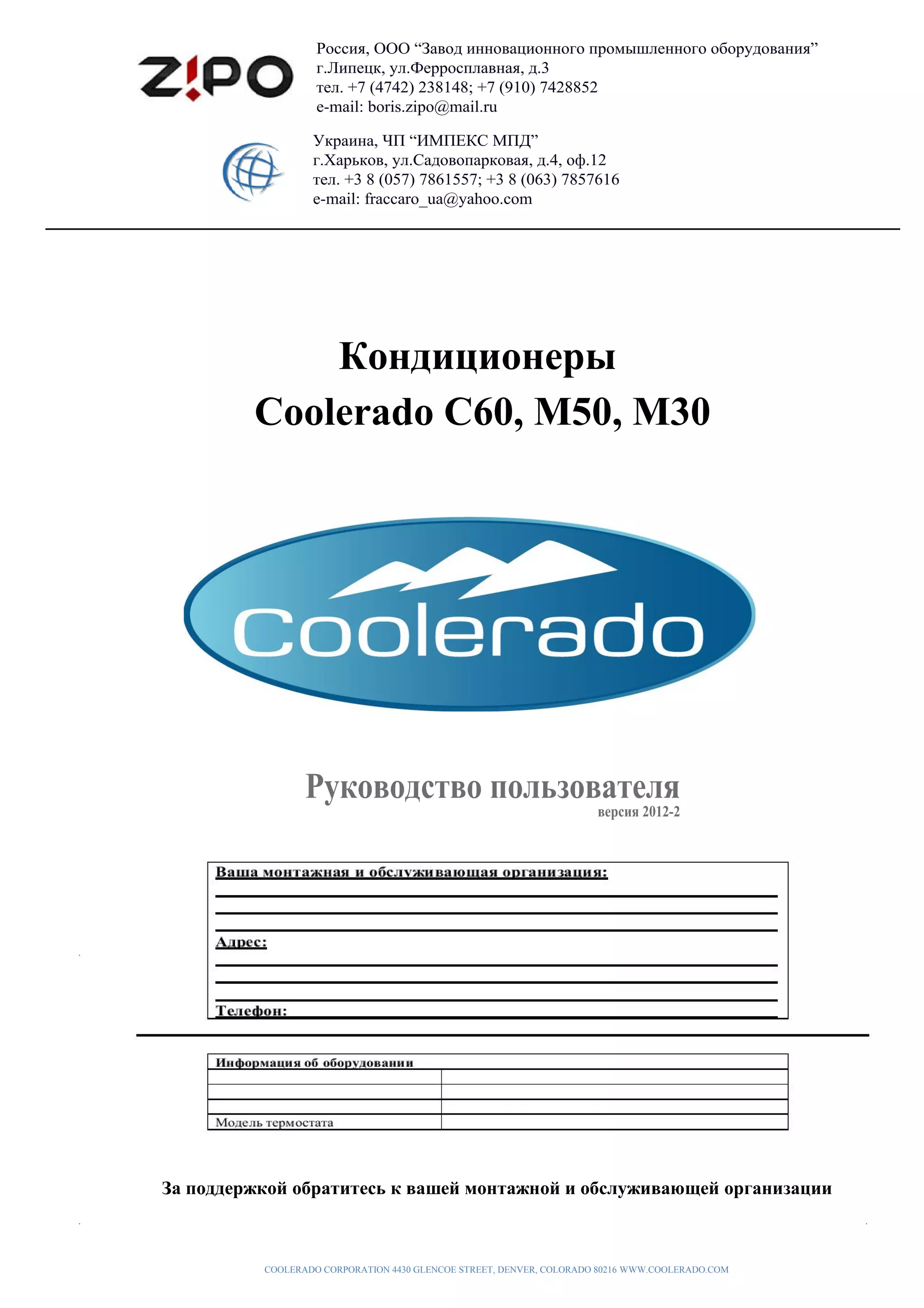 Документ представляет руководство пользователя для систем воздушного кондиционирования Coolerado, включая идентификацию системы, инструкции по эксплуатации, важные замечания и рекомендации по профилактическому обслуживанию. Описываются преимущества технологий, используемых в кондиционерах, такие как высокая эффективность, отсутствие вредных хладагентов и необходимость регулярного осмотра фильтров и систем водоснабжения. В документе также указаны важные аспекты установки системы и советы по поддержанию ее работоспособности.
