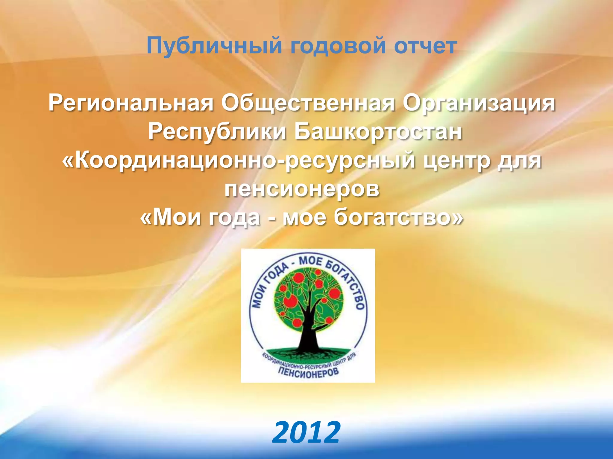 Публичный годовой отчет региональной общественной организации Республики Башкортостан "Координационно-ресурсный центр для пенсионеров "Мои года - мое богатство" за 2012 год подробно рассказывает о целях и деятельности организации, направленных на улучшение жизни пожилых людей. Организация осуществляет различные проекты, сотрудничает с международными учреждениями и активно привлекает волонтеров для реализации своих инициатив. Основное внимание уделяется созданию условий для активного участия пожилых людей в обществе и преодолению стереотипов, связанных с возрастом.