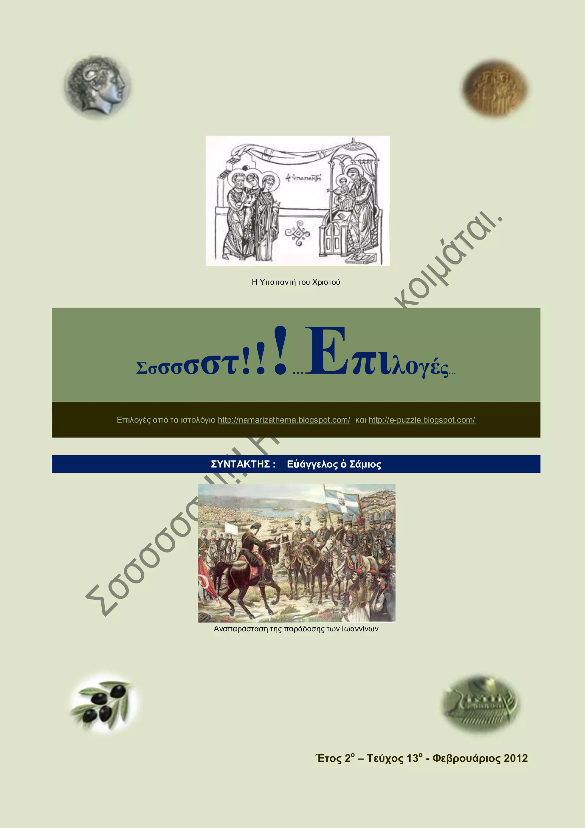Τα ιστολόγια ¨Σσσσσσσστ !!!!!! Ησυχία ................... κοιμάται.¨ και ¨Παζλ Ενημέρωσης¨ σας παρουσιάζουν το δέκατο τρίτο τεύχος με επιλογές αναρτήσεων. Έχουμε ήδη εισέλθει στο 2ο χρόνο αυτής της προσπάθειας. Θα αναρτηθεί στο ¨Παζλ Ενημέρωσης, απ΄όπου θα μπορείτε να το κατεβάσετε στον υπολογιστή σας, για ευκολότερη ανάγνωση. Προτείνουμε ¨ΠΛΗΡΗ ΟΘΟΝΗ¨ για μία σελίδα. Επίσης με κλικ επί ενός θέματος στα περιεχόμενα, μεταβαίνετε στην σελίδα που αντιστοιχεί, η εν λόγω ανάρτηση.