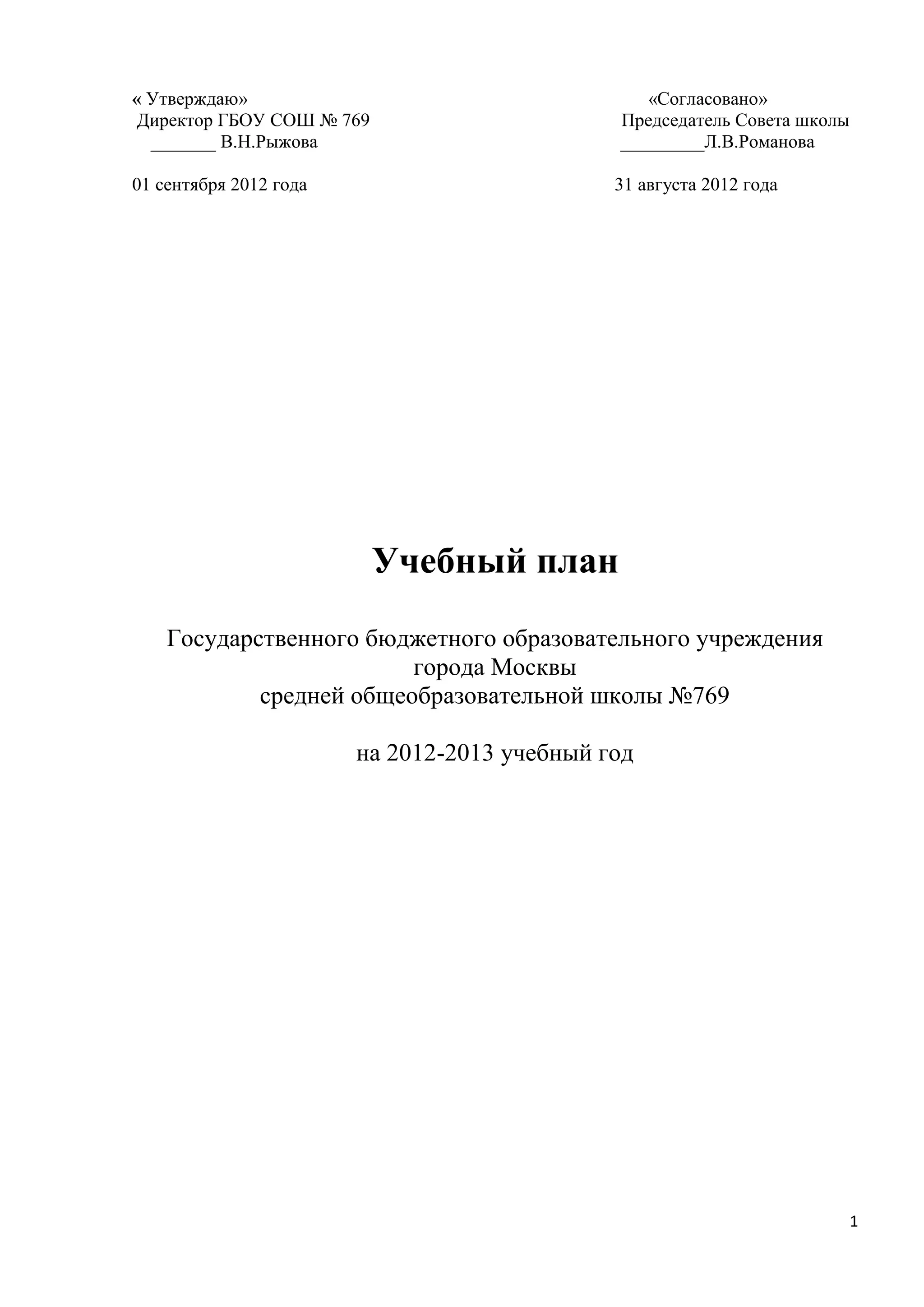 Документ представляет учебный план ГБОУ СОШ № 769 на 2012-2013 учебный год, основанный на нормативных документах и санитарных требованиях. В нем прописаны основные области учебной деятельности, включая обязательные предметы, профильное образование и особенности реализации учебных курсов. Учебный план обеспечивает гармоничное развитие учащихся и соответствует требованиям федерального и регионального уровней образования.