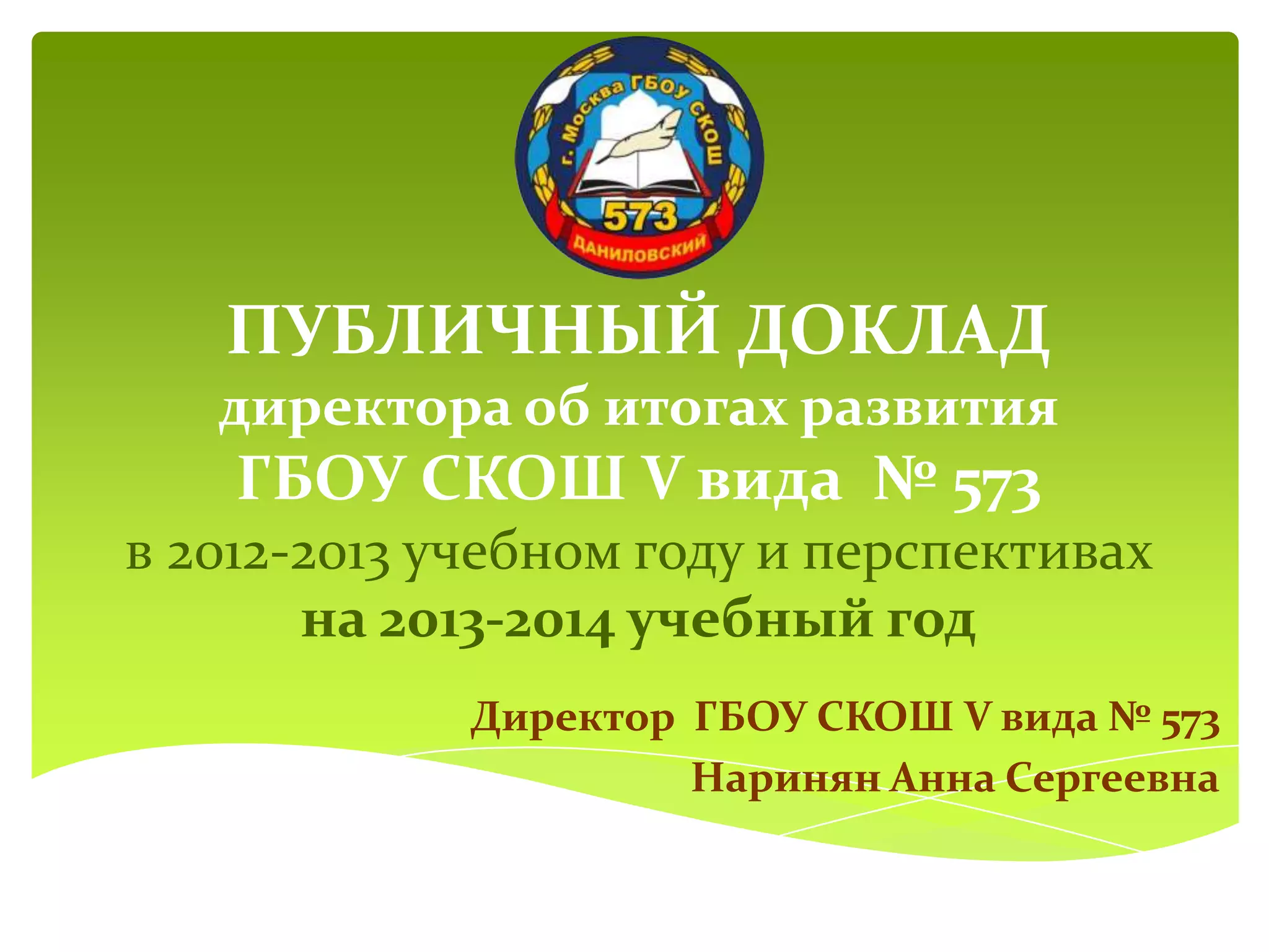 Доклад директора ГБОУ СКОШ V вида № 573 охватывает итоги учебного года 2012-2013 и планы на 2013-2014 год, акцентируя внимание на реформировании образовательного процесса в соответствии с федеральными стандартами. Основные направления развития включают интеграцию технологий обучения, поддержку учащихся с ОВЗ, обеспечение кадровой квалификации и развитие ученического самоуправления. Также представлены достижения, такие как награды педагогов и успешность в проведении дополнительных образовательных мероприятий.