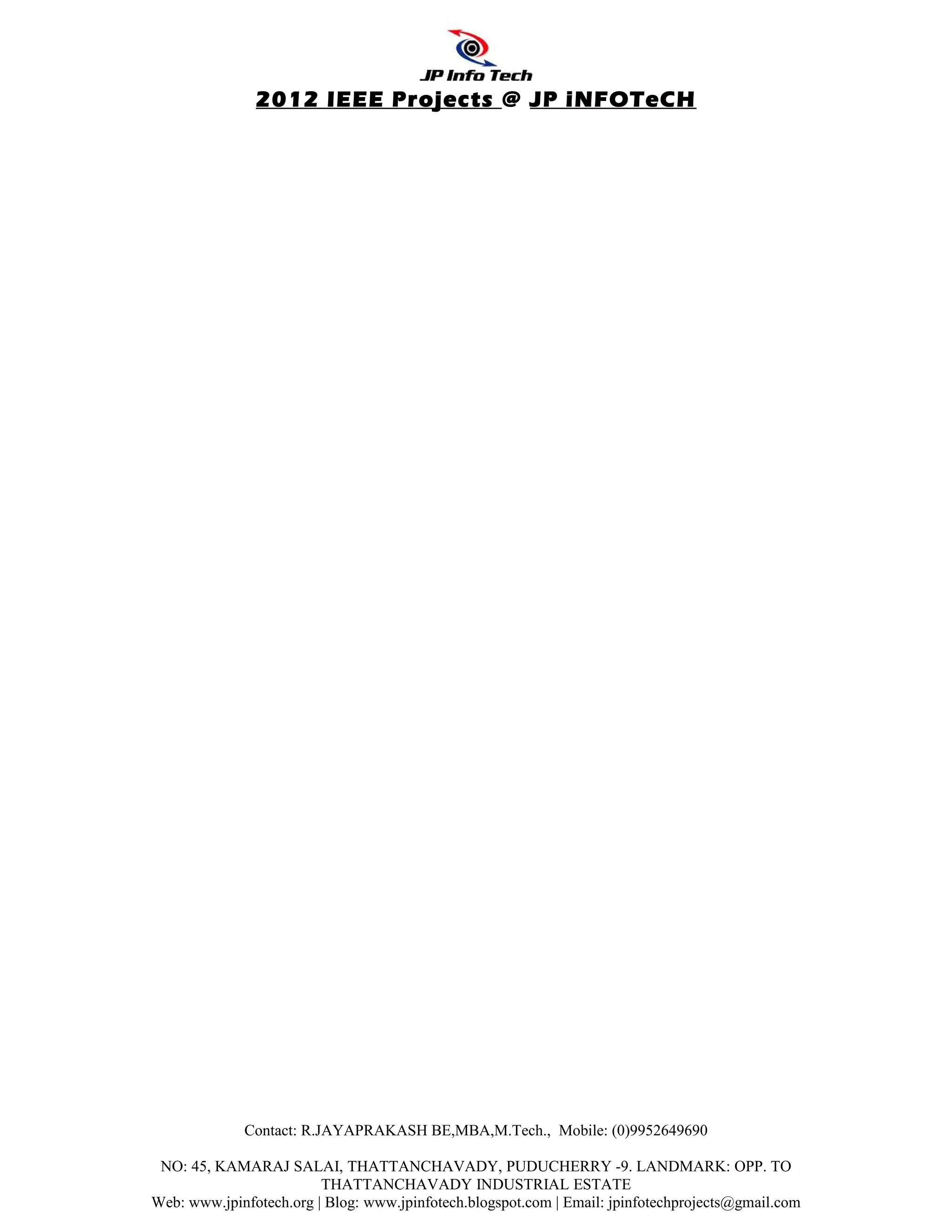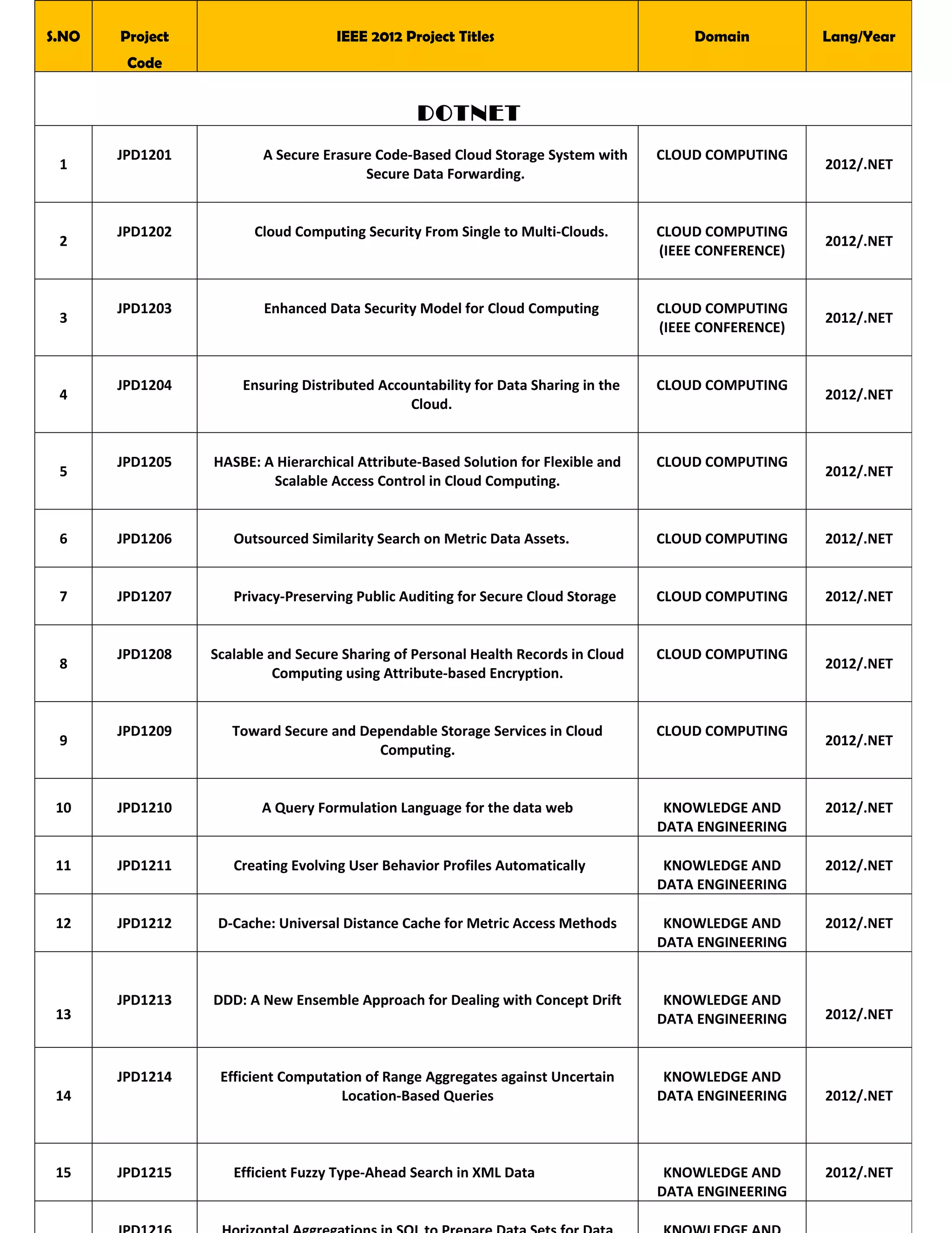 This document lists 15 IEEE projects from 2012 focused on cloud computing and knowledge and data engineering. The projects covered topics such as secure cloud storage, cloud security, privacy-preserving auditing, and attribute-based access control in cloud computing. In knowledge and data engineering, the projects addressed query languages, user behavior profiles, distance caching, and type-ahead search in XML data. JP iNFOTeCH provides support for students on these projects, including journal publications, review documents, presentations, assignments, certification, and placement support.