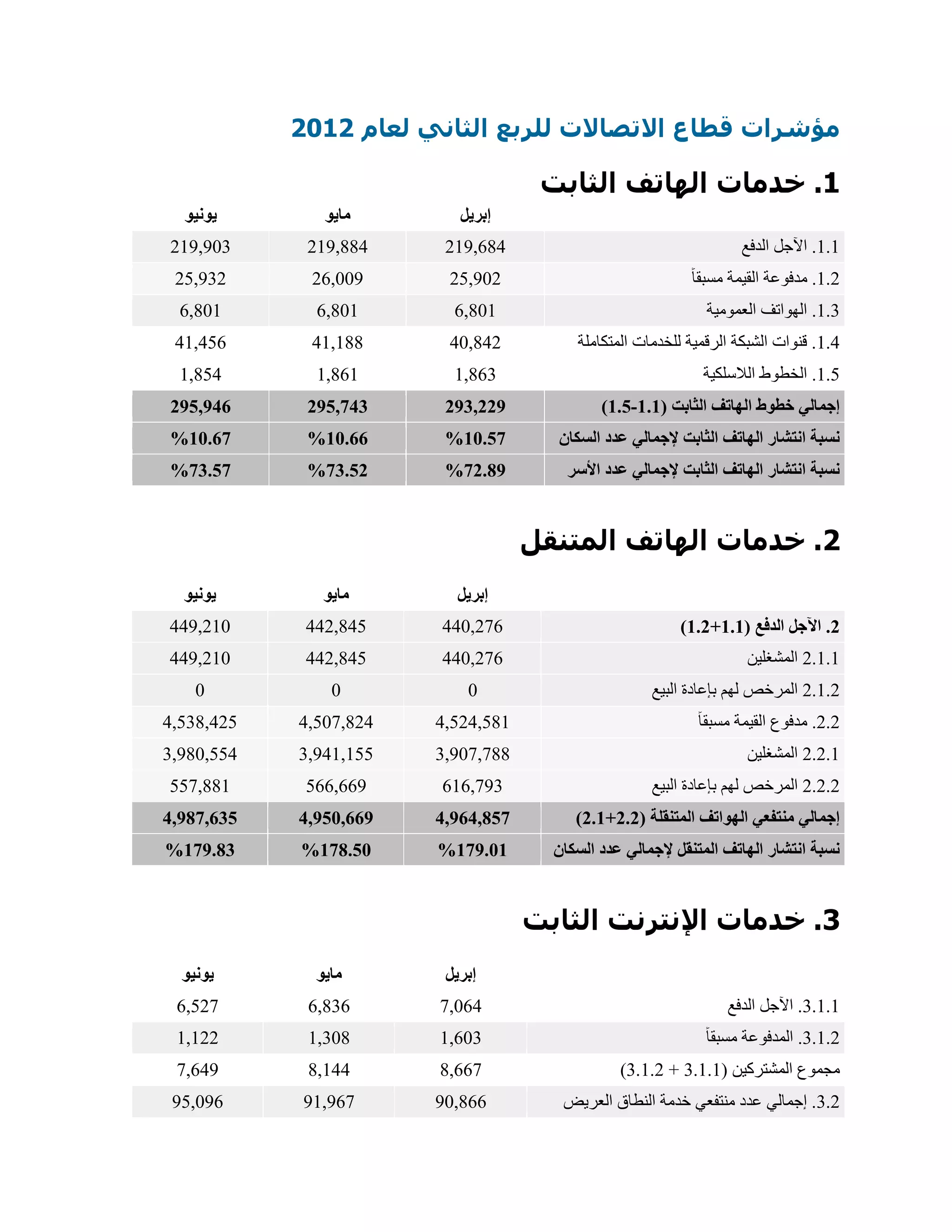 تقدم الوثيقة بيانات عن مؤشرات قطاع الاتصالات للفترة من إبريل إلى يونيو 2021، بما في ذلك أعداد خطوط الهاتف الثابت والمحمول وانتشار الإنترنت. تسلط البيانات الضوء على نمو خدمات الدفع الآجل والمرتبط بالهاتف والمتنقل، بالإضافة إلى زيادة نسبة انتشار الهواتف الثابتة والمحمولة بين السكان. الإجماليات تظهر تباينًا في الاستخدام بين الأسر والسكان وتحسينًا في الوصول إلى خدمات الإنترنت.