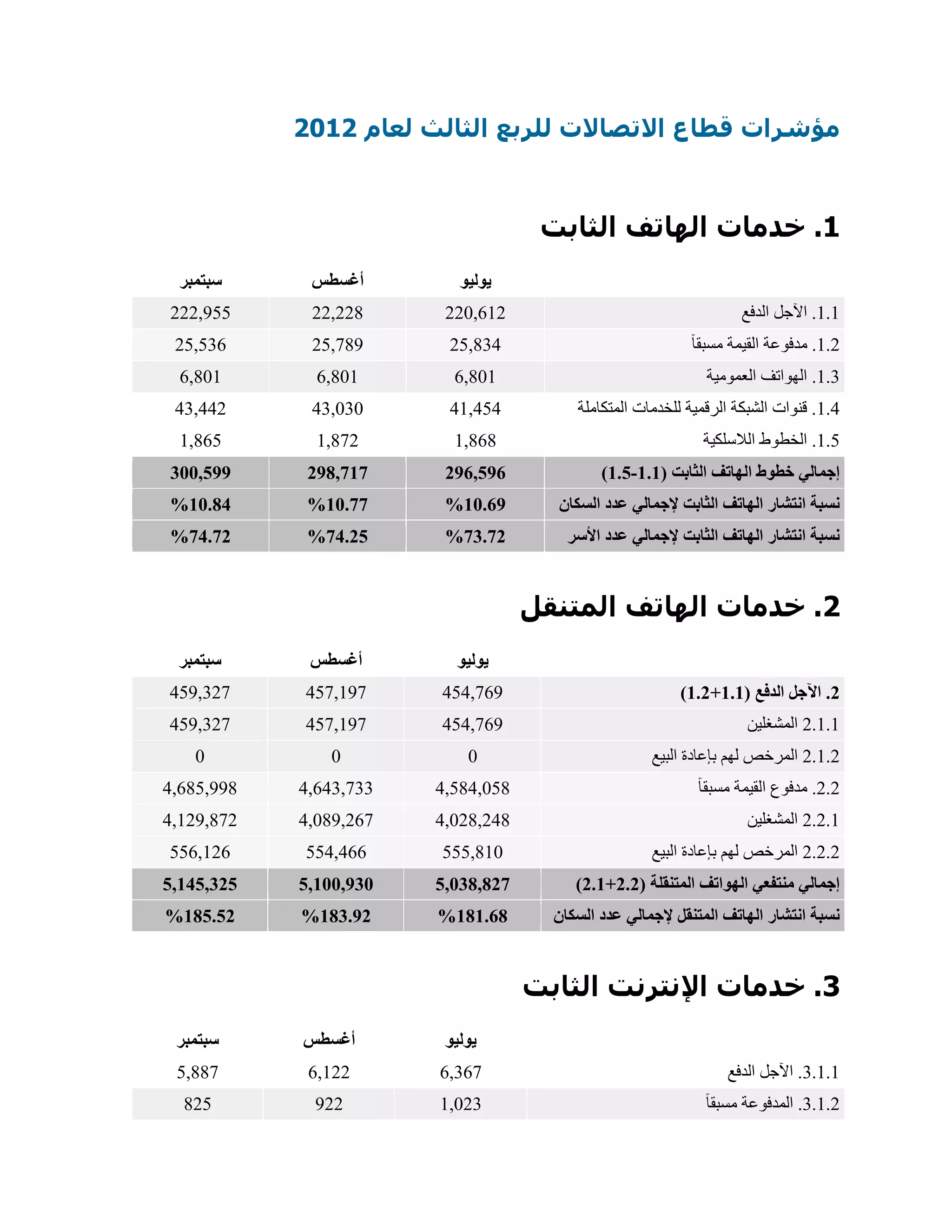 تمت مراجعة مؤشرات قطاع الاتصالات للربع الثالث من عام 2022، حيث تم تسجيل أرقام ملحوظة في خدمات الهاتف الثابت والمحمول والإنترنت. أظهرت البيانات زيادة في انتشار الهاتف الثابت والهاتف المحمول، بالإضافة إلى ارتفاع عدد المشتركين في خدمات الإنترنت الثابت والمحمول. كما سجلت الوثيقة نسب انتشار تتعلق بالسكان والأسر لكل فئة من هذه الخدمات.