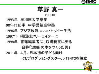 PROFILE 1993年 早稲田大学卒業 90年代前半 中学受験進学塾 1996年 アジア放浪(主にインド)・ヒッピー生活 1997年 帰国後フリーライターに 1998年 書籍編集者に、以降現在に至る 自称「100冊の本をつくった男」 2011年 4月、日本初の子ども向け ICT/プログラミングスクール TENTOを設立 2