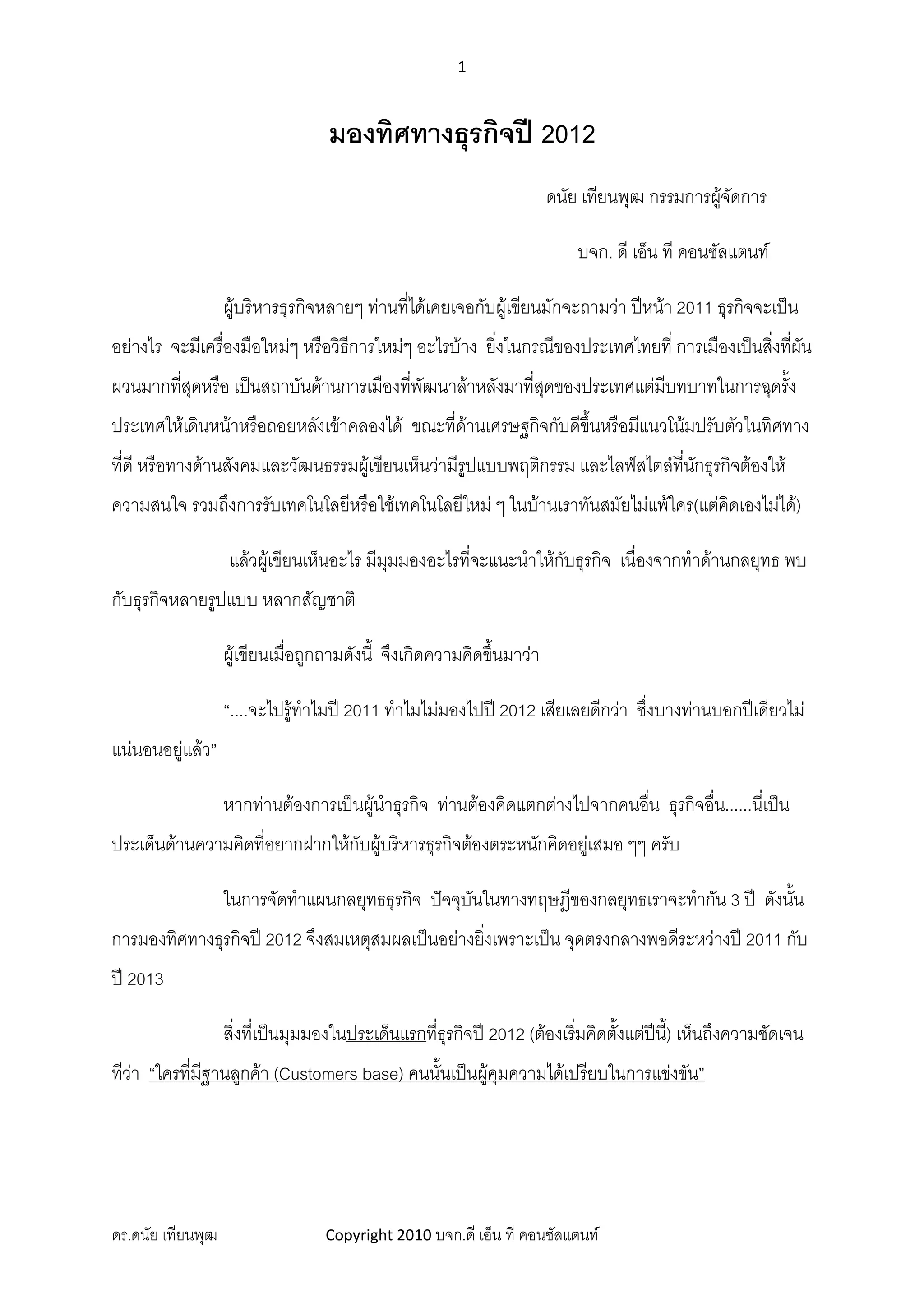 มองทิศทางธุรกิจป 2012 ดนัย เทียนพุฒ กรรมการผูจัดการ บจก. ดี เอ็น ที คอนซัลแตนท ผูบริหารธุรกิจหลายๆ ทานทีไดเคยเจอกับผูเขียนมักจะถามวา ปหนา 2011 ธุรกิจจะเปน ่ อยางไร จะมีเครื่องมือใหมๆ หรือวิธการใหมๆ อะไรบาง ยิ่งในกรณีของประเทศไทยที่ การเมืองเปนสิ่งที่ผน ี ั ผวนมากที่สุดหรือ เปนสถาบันดานการเมืองทีพฒนาลาหลังมาที่สุดของประเทศแตมีบทบาทในการฉุดรั้ง ่ ั ประเทศใหเดินหนาหรือถอยหลังเขาคลองได ขณะที่ดานเศรษฐกิจกับดีขึ้นหรือมีแนวโนมปรับตัวในทิศทาง ที่ดี หรือทางดานสังคมและวัฒนธรรมผูเขียนเห็นวามีรูปแบบพฤติกรรม และไลฟสไตลที่นกธุรกิจตองให ั ความสนใจ รวมถึงการรับเทคโนโลยีหรือใชเทคโนโลยีใหม ๆ ในบานเราทันสมัยไมแพใคร(แตคิดเองไมได) แลวผูเ ขียนเห็นอะไร มีมุมมองอะไรทีจะแนะนําใหกบธุรกิจ เนื่องจากทําดานกลยุทธ พบ ่ ั กับธุรกิจหลายรูปแบบ หลากสัญชาติ ผูเขียนเมื่อถูกถามดังนี้ จึงเกิดความคิดขึนมาวา ้ “....จะไปรูทาไมป 2011 ทําไมไมมองไปป 2012 เสียเลยดีกวา ซึงบางทานบอกปเดียวไม ํ ่ แนนอนอยูแลว” หากทานตองการเปนผูนาธุรกิจ ทานตองคิดแตกตางไปจากคนอืน ธุรกิจอื่น......นี่เปน ํ ่ ประเด็นดานความคิดที่อยากฝากใหกับผูบริหารธุรกิจตองตระหนักคิดอยูเสมอ ๆๆ ครับ ในการจัดทําแผนกลยุทธธุรกิจ ปจจุบันในทางทฤษฎีของกลยุทธเราจะทํากัน 3 ป ดังนัน ้ การมองทิศทางธุรกิจป 2012 จึงสมเหตุสมผลเปนอยางยิ่งเพราะเปน จุดตรงกลางพอดีระหวางป 2011 กับ ป 2013 สิ่งที่เปนมุมมองในประเด็นแรกที่ธุรกิจป 2012 (ตองเริ่มคิดตั้งแตปนี้) เห็นถึงความชัดเจน ทีวา “ใครที่มฐานลูกคา (Customers base) คนนั้นเปนผูคุมความไดเปรียบในการแขงขัน” ี ดร.ดนัย เทียนพุฒ Copyright 2010 บจก.ดี เอ็น ที คอนซัลแตนท