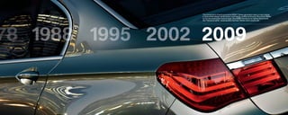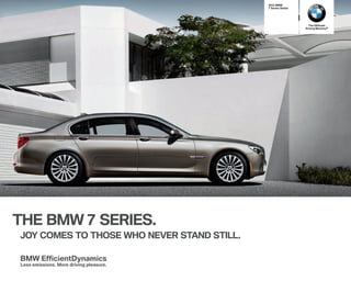 The document provides information about the BMW 7 Series sedan. It highlights key features of the exterior and interior design including the signature twin-kidney grille, sculpted details, and driver-focused cockpit. Technology features are discussed such as efficient dynamics, active cruise control, night vision, and various driver assistance systems. The long-wheelbase models are noted as providing more rear passenger space and comfort features.